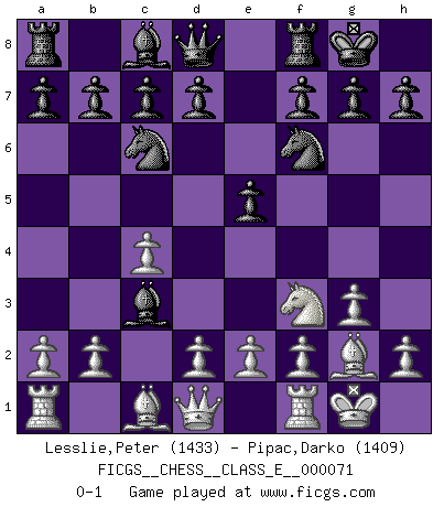 Last move : 0-1 2008 February 24 14:25:23 [Event "FICGS__CHESS__CLASS_E__000071"] [Site "FICGS"] [Date "2008.01.01"] [Round "1"] [White "Lesslie,Peter"] [Black "Pipac,Darko"] [Result "0-1"] [WhiteElo "1433"] [BlackElo "1409"] 1.c4 e5 2.Nc3 Nc6 3.g3 Nf6 4.Bg2 Bb4 5.Nf3 O-O 6.O-O Bxc3 0-1 This chess game has been lost on time (started : 2008.01.01 1:8:18) English : Sicilian Reversed Kingside Castling by player Black (move 5) Kingside Castling by player White (move 6) Player Black won this chess game. Follow this game move after move (download)Chess is a terrific way for kids to build self image and self esteem. (Saudin Robovic) Wir können eben der zündenden Macht des Opfers nicht wiederstehen, denn die Begeisterung für das Opfer liegt in der Natur des Menschen. (Rudolf Spielmann) El Ajedrez es un juego terrible. Si no dominas el centro, tu oponente tiene una posición mas libre. Si tu tienes el centro, entonces realmente tienes algo de que preocuparte. (Siegbert Tarrasch) Aux échecs, les retours au sommet sont rares : les dommages psychologiques consécutifs à une défaite sont trop sévères. (Daily Telegraph) Chess, like love, like music, has the power to make people happy. (Siegbert Tarrasch)