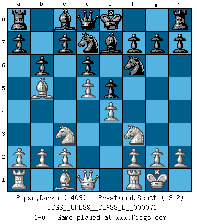 Last move : 1-0 2008 March 7 15:26:11 [Event "FICGS__CHESS__CLASS_E__000071"] [Site "FICGS"] [Date "2008.01.01"] [Round "1"] [White "Pipac,Darko"] [Black "Prestwood,Scott"] [Result "1-0"] [WhiteElo "1409"] [BlackElo "1312"] 1.e4 e6 2.d4 d6 3.Nf3 Nd7 4.Nc3 Be7 5.Bc4 b6 6.d5 e5 7.Bb5 Ngf6 8.O-O 1-0 This chess game has been lost on time (started : 2008.01.01 1:8:18) Lengfellner system Kingside Castling by player White (move 8) Player White won this chess game. Follow this game move after move (download)The boy (then a 12 year old boy named Anatoly Karpov) doesn't have a clue about Chess, and there's no future at all for him in this profession. (Mikhail Botvinnik) Ich würde mich als ganz normalen Jungen bezeichnen [Im Alter von 12]. (Sergej Karjakin) El Ajedrez expande y enriquece tu mente. (Saudin Robovic) Les Echecs ont trois composantes : le temps, l'espace et le matériel en dernier. (Mikhail Tal) There are two kinds of people in the world, my friend. Those who have a loaded gun and those who dig. You dig ! (Blondie in The Good, The Bad and The Ugly)