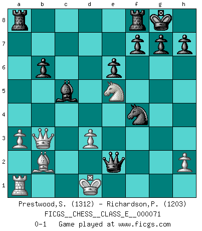 Last move : 0-1 2008 May 22 10:26:52 [Event "FICGS__CHESS__CLASS_E__000071"] [Site "FICGS"] [Date "2008.01.01"] [Round "1"] [White "Prestwood,Scott"] [Black "Richardson,Patrick"] [Result "0-1"] [WhiteElo "1312"] [BlackElo "1203"] 1.Nf3 d5 2.c4 c6 3.e3 Nf6 4.Nc3 e6 5.Qc2 Na6 6.a3 Be7 7.b4 O-O 8.c5 b6 9.cxb6 axb6 10.Bb2 c5 11.b5 Nc7 12.Be2 d4 13.Ne4 Bb7 14.O-O Bxe4 15.d3 Bb7 16.exd4 Nxb5 17.dxc5 Bxc5 18.Ne5 Nd4 19.Qd2 Nb3 20.Qc3 Nxa1 21.Rxa1 Nd5 22.Qb3 Nf4 23.Bf1 Bxg2 24.Bxg2 Qg5 25.Kf1 Qxg2+ 26.Ke1 Qxf2+ 27.Kd1 Qe2+ 0-1 This chess game has been lost on time (started : 2008.01.01 1:8:18) Reti Opening Kingside Castling by player Black (move 7) Kingside Castling by player White (move 14) Player Black won this chess game. Follow this game move after move (download)Different people feel differently about resigning. (Bobby Fischer) Um sich vor der Gefahr einer Erkältung zu schützen, sorge der wanderlustige König beizeiten für ein brauchbares Versteck. (Aaron Nimzowitsch) ¿Cual es el objetivo de jugar una apertura de gambito?... Para adquirir una reputación de ser un jugador apuesto a costo de perder el juego. (Siegbert Tarrasch) Le système Elo représente seulement une moyenne. Il est simplement un indicateur de votre stabilité. (Anatoli Karpov) If everyone is thinking alike, then somebody isn't thinking. (US General George S. Patton)