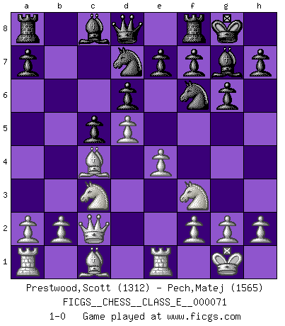 Last move : 1-0 2008 March 21 16:48:40 [Event "FICGS__CHESS__CLASS_E__000071"] [Site "FICGS"] [Date "2008.01.01"] [Round "1"] [White "Prestwood,Scott"] [Black "Pech,Matej"] [Result "1-0"] [WhiteElo "1312"] [BlackElo "1565"] 1.d4 Nf6 2.c4 c5 3.d5 b5 4.Nf3 g6 5.Qc2 bxc4 6.e4 d6 7.Bxc4 Bg7 8.Nc3 Nbd7 9.O-O O-O 10.Re1 1-0 This chess game has been lost on time (started : 2008.01.01 1:8:18) Benko gambit Kingside Castling by player White (move 9) Kingside Castling by player Black (move 9) Player White won this chess game. Follow this game move after move (download)If one piece is badly posted, the whole game is bad. (Tarrasch) Frage: Was machen Sie mit den Preisen? Anwort: Ich habe Angst, dass meine Freundin davon neue Kleider kauft. (Loek van Wely) El Ajedrez es despiadado: debes de estar preparado para matar gente. (Nigel Short) Je fais ceci parce que dans cinquante coups j'obtiendrai cela; je m'appelle Mikhail Moisevitch Botvinnik. (Botvinnik) A government big enough to give you everything you want is strong enough to take everything you have. (Thomas Jefferson)
