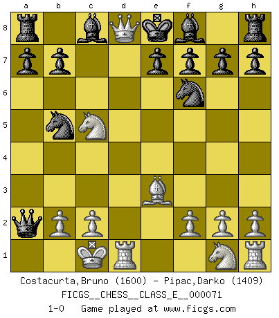 Last move : 1-0 2008 January 22 8:17:7 [Event "FICGS__CHESS__CLASS_E__000071"] [Site "FICGS"] [Date "2008.01.01"] [Round "1"] [White "Costacurta,Bruno"] [Black "Pipac,Darko"] [Result "1-0"] [WhiteElo "1600"] [BlackElo "1409"] 1.d4 d5 2.Nc3 Nc6 3.e4 dxe4 4.Nxe4 Qxd4 5.Bd3 Qd5 6.Qf3 Nd4 7.Qg3 Qe6 8.Be3 Nf5 9.Qxc7 Nd6 10.O-O-O Nf6 11.Nc5 Qxa2 12.Bb5+ Nxb5 13.Qd8+ 1-0 Queen's pawn : Chigorin variation Queenside Castling by player White (move 10) Player White won this chess game. Follow this game move after move (download)Fischer, who may or may not be mad as a hatter, has every right to be horrified. (Jeremy Silman) Ich liebe den Moment, wenn ich das Ego meines Gegenüber breche. (Robert James Fischer) Si el ingenio solamente fuese necesario para lucirse, las mujeres serían las mejores jugadoras de Ajedrez del mundo. (Albin) Les échecs, c'est l'imagination. (David Bronstein) Memory is a complicated thing, a relative to truth, but not its twin. (Barbara Kingsolver, Animal Dreams)