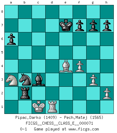 Last move : 0-1 2008 July 28 12:48:11 [Event "FICGS__CHESS__CLASS_E__000071"] [Site "FICGS"] [Date "2008.01.01"] [Round "1"] [White "Pipac,Darko"] [Black "Pech,Matej"] [Result "0-1"] [WhiteElo "1409"] [BlackElo "1565"] 1.e4 e5 2.d4 exd4 3.c3 d5 4.Qxd4 Nf6 5.Bg5 Be7 6.Bxf6 Bxf6 7.Qxd5 Qxd5 8.exd5 c6 9.Ne2 cxd5 10.g3 Nc6 11.Bg2 Bf5 12.Bxd5 Nb4 13.Bxb7 Nc2+ 14.Kd2 Rb8 15.Bc6+ Ke7 16.Na3 Nxa1 17.b3 Rhd8+ 18.Kc1 Rxb3 19.axb3 Nxb3+ 20.Kb2 Na5 21.Ba4 Rd2+ 22.Bc2 Rxe2 23.f4 Be4 24.Rd1 a6 25.Kb1 Bxc3 26.Bxe4 Rb2+ 27.Kc1 Nb3+ 0-1 Danish gambit : Soerensen defense Player Black won this chess game. Follow this game move after move (download)Chess is 99 percent tactics. (Teichmann) Nie in meinem Leben habe ich die französische Verteidigung gespielt, welche die Stumpfsinnigste von allen ist. (Wilhelm Steinitz) Evita las multitudes. Haz independientemente tu propio razonamiento. Trata de ser el jugador de Ajedrez, no la pieza de Ajedrez. (Ralph Charell) Avec des compensations pour le matériel en plus... (Anonyme) Life doesn't imitate art, it imitates bad television. (Woody Allen)