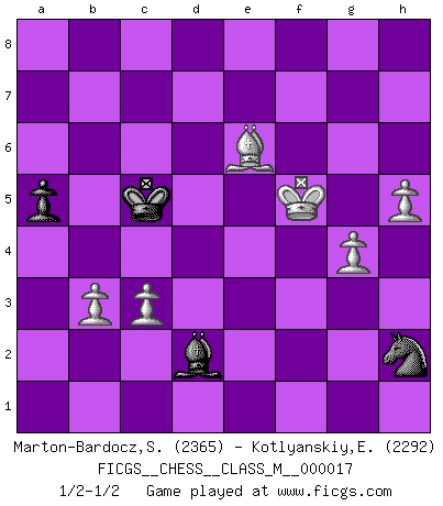 Last move : 1/2-1/2 2008 August 13 23:39:11 [Event "FICGS__CHESS__CLASS_M__000017"] [Site "FICGS"] [Date "2008.01.01"] [Round "1"] [White "Marton-Bardocz,Sandor"] [Black "Kotlyanskiy,Edward"] [Result "1/2-1/2"] [WhiteElo "2365"] [BlackElo "2292"] 1.e4 c5 2.Nf3 d6 3.d4 cxd4 4.Nxd4 Nf6 5.Nc3 a6 6.Bc4 e6 7.Bb3 b5 8.Bg5 Be7 9.Qf3 Qc7 10.e5 Bb7 11.exd6 Bxd6 12.Qe3 Bc5 13.O-O-O Nc6 14.Bxf6 gxf6 15.Nd5 Qd8 16.Qf4 Bxd4 17.Nc7+ Ke7 18.Rhe1 e5 19.Nd5+ Kd6 20.Qf5 Bc8 21.Qf3 h5 22.Nxf6 Bg4 23.Qd5+ Kc7 24.Qxf7+ Kb6 25.c3 Bxd1 26.Rxd1 Rc8 27.Bc2 a5 28.Kb1 Ka6 29.a4 Rc7 30.axb5+ Ka7 31.b6+ Bxb6 32.Rxd8 Rxf7 33.Rxh8 Rxf6 34.f3 Be3 35.Rxh5 Rh6 36.Rxh6 Bxh6 37.h4 Bf4 38.g4 Bg3 39.h5 Bf4 40.Bf5 Kb6 41.Kc2 Kc5 42.Kd3 Nd8 43.b3 Bh6 44.Ke4 Nf7 45.Be6 Ng5+ 46.Kxe5 Nxf3+ 47.Ke4 Nh2 48.Kf5 Bd2 1/2-1/2 Sicilian : Najdorf, Lipnitzky attack Queenside Castling by player White (move 13) 10 pieces endgame at move 46 : White KBPPPP , Black KBNP WHITE : King + 1 Bishop 4 Pawns BLACK : King + 1 Bishop 1 Knight 1 Pawn This chess game ended in a draw. Follow this game move after move (download)When I have White, I win because I am white; When I have Black, I win because I am Bogolyubov. (Bogolyubov) Jede Eröffnung ist gut genug um gespielt zu werden, wenn nur ihr Ruf schlecht genug ist. (Savielly Grigorievitsch Tartakower) La vida es como un juego de Ajedrez, cambiando con cada movimiento. (Proverbio Chino) RxDa4 pat (...) You think that education is too expensive ? Try ignorance. (Derek Bok)