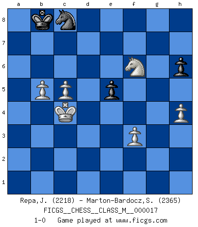 Last move : 1-0 2008 November 15 9:7:53 [Event "FICGS__CHESS__CLASS_M__000017"] [Site "FICGS"] [Date "2008.01.01"] [Round "1"] [White "Repa,Jason"] [Black "Marton-Bardocz,Sandor"] [Result "1-0"] [WhiteElo "2218"] [BlackElo "2365"] 1.e4 c5 2.Nf3 d6 3.d4 cxd4 4.Nxd4 Nf6 5.Nc3 a6 6.Be3 e5 7.Nb3 Be6 8.f3 Be7 9.Qd2 Nbd7 10.g4 h6 11.O-O-O b5 12.h4 Nb6 13.Qf2 Rb8 14.Nc5 b4 15.Nb1 d5 16.exd5 Nfxd5 17.Nxa6 Rc8 18.Bb5+ Kf8 19.Bc5 Bxc5 20.Nxc5 Qc7 21.Na6 Qe7 22.Nd2 Bd7 23.Bd3 Nf4 24.Qxb6 Nxd3+ 25.Kb1 Rc6 26.Qb8+ Rc8 27.Qa7 Nf4 28.Nxb4 Bb5 29.Qa5 Be2 30.Rde1 Qd8 31.Qxd8+ Rxd8 32.Kc1 f6 33.Rh2 Bb5 34.c4 Rc8 35.b3 Ke7 36.Kc2 Rhd8 37.Kc3 Bc6 38.a4 Rd4 39.a5 Ba8 40.a6 Kd6 41.Ne4+ Ke7 42.a7 Rd7 43.Ra2 Ne6 44.g5 Bb7 45.gxf6+ gxf6 46.Ra5 Ra8 47.Rea1 Nd4 48.Nc5 Rc7 49.Nxb7 Rxb7 50.Nd5+ Kf7 51.b4 Nc6 52.Ra6 Rbxa7 53.Rxa7+ Rxa7 54.Rxa7+ Nxa7 55.b5 Ke6 56.Nb4 Nc8 57.c5 Kd7 58.Kc4 Kc7 59.Nd5+ Kb8 60.Nxf6 1-0 Sicilian : Najdorf, Byrne (English) attack Queenside Castling by player White (move 11) 10 pieces endgame at move 60 : White KNPPPP , Black KNPP WHITE : King + 1 Knight 4 Pawns BLACK : King + 1 Knight 2 Pawns Player White won this chess game. Follow this game move after move (download)Alekhine is a poet who creates a work of art out of something that would hardly inspire another man to send home a picture post card. (Max Euwe) Es ist peinlich, dass ich nie Weltmeister wurde. Es wäre leicht, Leonid Breschnjew als Ursache vorzuschieben, dessen Apparat den Vorzeigekommunisten Anatoli Karpow in allem unterstützte. Aber Garri Kasparow zum Beispiel, der ebenfalls von den Sowjets unerwünscht war, hat trotz der Widerstände den WM-Titel erobert. (Viktor Kortschnoi) Si el ingenio solamente fuese necesario para lucirse, las mujeres serían las mejores jugadoras de Ajedrez del mundo. (Albin) Seul un grand joueur sait à quel point il joue faiblement. (Xavier Tartacover) Any activity becomes creative when the doer cares about doing it right or doing it better. (John Updike)