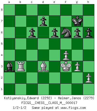 Last move : 1/2-1/2 2008 May 22 19:35:8 [Event "FICGS__CHESS__CLASS_M__000017"] [Site "FICGS"] [Date "2008.01.01"] [Round "1"] [White "Kotlyanskiy,Edward"] [Black "Helmer,Janos"] [Result "1/2-1/2"] [WhiteElo "2292"] [BlackElo "2279"] 1.e4 c5 2.Nf3 Nc6 3.Nc3 e6 4.d4 cxd4 5.Nxd4 Qc7 6.Be2 a6 7.O-O Nf6 8.Be3 Bb4 9.Na4 O-O 10.Nxc6 bxc6 11.Nb6 Rb8 12.Nxc8 Rfxc8 13.Bxa6 Re8 14.Bd3 Bd6 15.Kh1 Be5 16.c3 Rxb2 17.Qc1 Qb7 18.f4 Bc7 19.e5 Nd5 20.Bc5 Ba5 21.Bb4 Rxb4 22.cxb4 Qxb4 23.Rb1 Qd4 24.Rf3 f6 25.exf6 Nxf6 26.Qc2 Bc7 27.g3 Ra8 28.Kg2 Qa7 29.a3 Bd6 30.Bc4 Kh8 31.Rfb3 Qc5 32.Qc3 h6 33.Be2 Qxc3 34.Rxc3 Rxa3 35.Rxa3 Bxa3 36.Rb8+ Kh7 37.Bd3+ g6 38.Kf3 Kg7 39.Rb3 1/2-1/2 Sicilian defense Kingside Castling by player White (move 7) Kingside Castling by player Black (move 9) This chess game ended in a draw. Follow this game move after move (download)There's never before been a Chess player with such a thorough knowledge of the intricacies of the game and such an absolutely indomitable will to win. I think Bobby is the greatest player that ever lived. (Lisa Lane) Dass jemand wie Surab Asmaiparaschwili, der selbst Elopunkte gekauft hat , Vize-Präsident der Fide werden konnte, sagt schon einges über den Zustand dieser Organisation aus. (Joel Lautier) Vive, pierde y aprende al observar a tu oponente como gana. (Amber Steenbock) Psychologiquement, tu dois avoir confiance en toi même, mais cette confiance doit être basée sur des faits. (Robert Fischer) Excelling at chess has long been considered a symbol of more general intelligence. That is an incorrect assumption in my view, as pleasant as it might be. But for the purposes of argument and investigation, chess is, in Russkin-Gutman's words, 'an unparalleled laboratory, since both the learning process and the degree of ability obtained can be objectified and quantified, providing an excellent comparative framework on which to use rigorous analytical techniques.' (The Chess Master and the Computer, by Garry Kasparov - 2010)