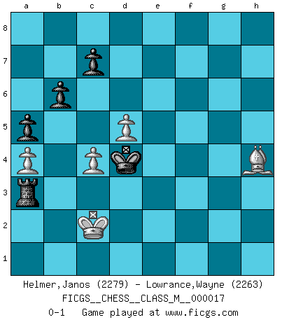 Last move : 0-1 2008 December 18 16:17:43 [Event "FICGS__CHESS__CLASS_M__000017"] [Site "FICGS"] [Date "2008.01.01"] [Round "1"] [White "Helmer,Janos"] [Black "Lowrance,Wayne"] [Result "0-1"] [WhiteElo "2279"] [BlackElo "2263"] 1.c4 Nf6 2.Nc3 e5 3.Nf3 Nc6 4.d4 exd4 5.Nxd4 Bb4 6.Bg5 h6 7.Bh4 O-O 8.e3 Re8 9.Rc1 Nxd4 10.Qxd4 g5 11.Bg3 d6 12.Be2 Ne4 13.O-O Nxc3 14.bxc3 Bc5 15.Qd2 Bf5 16.Rfd1 Qf6 17.Bd3 Bxd3 18.Qxd3 Qg6 19.Qxg6+ fxg6 20.Kf1 Re4 21.Rd4 Bxd4 22.cxd4 b6 23.Ke2 g4 24.f3 gxf3+ 25.gxf3 Re7 26.h4 Rf8 27.e4 g5 28.hxg5 hxg5 29.Rg1 Kh7 30.Be1 Ref7 31.Rg3 g4 32.fxg4 Rf4 33.Kd3 Rf3+ 34.Ke2 Rxg3 35.Bxg3 Kg6 36.e5 dxe5 37.Bxe5 Rf7 38.Ke3 Kg5 39.Ke4 Kxg4 40.a4 Rd7 41.Bf6 a6 42.d5 a5 43.Be5 Re7 44.Kd4 Kf5 45.Bh2 Rg7 46.Kd3 Rh7 47.Bg1 Rh3+ 48.Kd4 Rh1 49.Bf2 Rd1+ 50.Kc3 Ke4 51.Kc2 Rd4 52.Kc3 Rd3+ 53.Kc2 Ra3 54.Bh4 Kd4 0-1 English Opening Kingside Castling by player Black (move 7) Kingside Castling by player White (move 13) 10 pieces endgame at move 39 : White KBPPP , Black KRPPP WHITE : King + 1 Bishop 3 Pawns BLACK : King + 1 Rook 3 Pawns Player Black won this chess game. Follow this game move after move (download)A sacrifice is best refuted by accepting it. (Wilhelm Steinitz) Ich kenne keine einzige Person, die behaupten würde, Garri Kasparow sei ein guter Mensch (Nigel Short) Después de la respuesta de las negras a 1.e4 con 1..e5, se quedan siempre tratando de entrar dentro del juego. (Howard Staunton) Il vaut toujours mieux jouer un plan faux de façon logique que de n'avoir pas de plan du tout. (Victor Kortchnoï) When you stop learning you start dying. (M. Scott Adams)