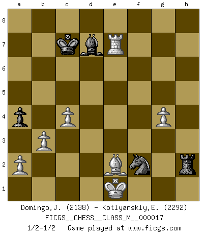 Last move : 1/2-1/2 2008 June 5 19:46:3 [Event "FICGS__CHESS__CLASS_M__000017"] [Site "FICGS"] [Date "2008.01.01"] [Round "1"] [White "Domingo,Jordi"] [Black "Kotlyanskiy,Edward"] [Result "1/2-1/2"] [WhiteElo "2138"] [BlackElo "2292"] 1.e4 c5 2.Nf3 d6 3.d4 cxd4 4.Nxd4 Nf6 5.Nc3 a6 6.Be3 e6 7.f3 b5 8.g4 h6 9.Qd2 b4 10.Nce2 Nbd7 11.O-O-O Qc7 12.Qxb4 d5 13.Qc3 Qxc3 14.Nxc3 e5 15.Nxd5 Nxd5 16.exd5 exd4 17.Bxd4 f6 18.Bd3 Kf7 19.d6 Bxd6 20.Bc4+ Ke8 21.Rhe1+ Kd8 22.Bxf6+ Nxf6 23.Rxd6+ Kc7 24.Rd3 Re8 25.Rxe8 Nxe8 26.Re3 Bd7 27.Be2 a5 28.f4 Rb8 29.c4 g6 30.Re5 a4 31.Re7 Nd6 32.Rg7 Rf8 33.Rxg6 Rxf4 34.Rxh6 Rf2 35.Kd1 Rg2 36.Rh7 Ne4 37.Re7 Nf2+ 38.Ke1 Rxh2 39.b3 1/2-1/2 Sicilian : Najdorf, Byrne (English) attack Queenside Castling by player White (move 11) This chess game ended in a draw. Follow this game move after move (download)The passed Pawn is a criminal, who should be kept under lock and key. Mild measures, such as police surveillance, are not sufficient. (Aaron Nimzovich) Stelle das Brett so, daß die Sonne in die Augen deines Gegners scheint. (Ruy López) Yo siempre he tenido un ligero sentimiento de lástima por una persona que no tiene conocimiento del Ajedrez. (Siegbert Tarrasch) Je crois qu'il existe des manières très spécifiques de jouer efficacement contre une machine. Evidemment, nous n'avons aucune chance en technique pure, parce que l'ordinateur calcule de manière parfaite. Mais lorsque nous faisons appel à notre cerveau, en utilisant l'intuition et la compréhension, alors nous restons beaucoup plus forts. (Anatoli Karpov) Inventor: A person who makes an ingenious arrangement of wheels, levers and springs, and believes it civilization. (Ambrose Bierce, The Devil's Dictionary)