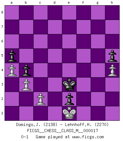 Last move : 0-1 2009 April 7 11:33:56 [Event "FICGS__CHESS__CLASS_M__000017"] [Site "FICGS"] [Date "2008.01.01"] [Round "1"] [White "Domingo,Jordi"] [Black "Lehnhoff,Heinz-Georg"] [Result "0-1"] [WhiteElo "2138"] [BlackElo "2270"] 1.e4 c5 2.Nf3 d6 3.d4 cxd4 4.Nxd4 Nf6 5.Nc3 a6 6.Be3 e5 7.Nb3 Be6 8.f3 Be7 9.Qd2 O-O 10.O-O-O Nbd7 11.g4 b5 12.Rg1 b4 13.Nd5 Bxd5 14.exd5 a5 15.g5 Nh5 16.Kb1 Rb8 17.Nc1 g6 18.b3 Kh8 19.h4 f6 20.Nd3 Nb6 21.Nc5 dxc5 22.d6 Re8 23.dxe7 Qxe7 24.Qf2 Red8 25.Rxd8+ Qxd8 26.gxf6 Nd5 27.Bc1 Nhxf6 28.Bc4 Nc3+ 29.Ka1 Qd6 30.Re1 Re8 31.a4 Nh5 32.Be3 Qf6 33.Bxc5 Ng7 34.Qd2 Nf5 35.Qd7 Rd8 36.Qe6 Qxe6 37.Bxe6 Rd2 38.Bxf5 gxf5 39.Kb2 Rd5 40.Bb6 Kg7 41.Kc1 Kg6 42.Bc7 e4 43.fxe4 fxe4 44.Bf4 Kf5 45.Bd2 h5 46.Bg5 Kg4 47.Bd2 Kf3 48.Rf1+ Kg2 49.Re1 Rf5 50.Be3 Rf1 51.Rxf1 Kxf1 52.Kd2 Kg2 53.Bd4 Kf3 54.Ke1 e3 55.Bc5 Nd5 56.Bd6 Nf4 57.Bxf4 Kxf4 58.Ke2 Ke4 59.Ke1 Kf3 60.Kf1 e2+ 61.Ke1 Ke3 0-1 Sicilian : Najdorf, Byrne (English) attack Kingside Castling by player Black (move 9) Queenside Castling by player White (move 10) 10 pieces endgame at move 57 : White KPPPP , Black KPPPP WHITE : King + 4 Pawns BLACK : King + 4 Pawns Player Black won this chess game. Follow this game move after move (download)The way he plays Chess demonstrates a man's whole nature. (Stanley Ellin) Ich kenne Menschen, die allen Willen der Welt besitzen und doch nicht Schach spielen können. (Robert James Fischer) Mis oponentes también hacen buenas movidas. A veces yo no tomo esas cosas en consideración. (Bobby Fischer) Comme les marins qui ont mille raisons différentes d'aller en mer, les joueurs d'échecs en ont tout autant avant de s'installer devant une table et jouer... (Vincent Bertignac, philosophe) Don't be discouraged. It's often the last key in the bunch that opens the lock. (Author unknown)