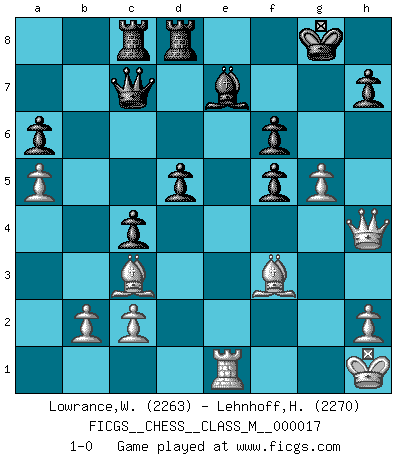 Last move : 1-0 2008 September 30 0:30:12 [Event "FICGS__CHESS__CLASS_M__000017"] [Site "FICGS"] [Date "2008.01.01"] [Round "1"] [White "Lowrance,Wayne"] [Black "Lehnhoff,Heinz-Georg"] [Result "1-0"] [WhiteElo "2263"] [BlackElo "2270"] 1.e4 c5 2.Nf3 e6 3.Nc3 a6 4.d4 cxd4 5.Nxd4 Qc7 6.Be2 Nf6 7.O-O Nc6 8.Be3 Bb4 9.Na4 Be7 10.Nxc6 bxc6 11.Nb6 Rb8 12.Nxc8 Qxc8 13.Bd4 c5 14.Be5 Rb6 15.Bf3 d6 16.Bc3 O-O 17.a4 Nd7 18.a5 Rb8 19.Be2 Rd8 20.Qd3 Ra8 21.Qg3 g6 22.Rad1 Qc6 23.Qf3 Ne5 24.Qe3 Nd7 25.f4 Nf6 26.Bf3 d5 27.exd5 Nxd5 28.Qe5 f6 29.Qe4 c4 30.Rfe1 Kf8 31.Kh1 Rac8 32.f5 gxf5 33.Qh4 Kg8 34.g4 Qc7 35.Rxd5 exd5 36.g5 1-0 Sicilian defense Kingside Castling by player White (move 7) Kingside Castling by player Black (move 16) Player White won this chess game. Follow this game move after move (download)Human affairs are like a Chess game: only those who do not take it seriously can be called good players. (Hung Tzu Ch'eng) Ein Isolani verdüstert die Stimmung auf dem ganzen Schachbrett. (Savielly Grigorievitsch Tartakower) Preferería tener un Peón que un dedo. (Reuben Fine) Tout change constamment, y compris dans le monde des Echecs. (Botvinnik) Philosophers use a language that is already deformed as though by shoes that are too tight. (Ludwig Wittgenstein)