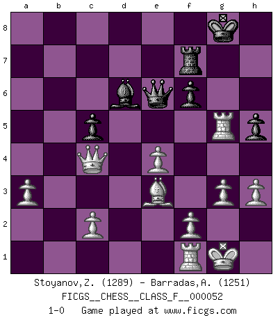 Last move : 1-0 2008 January 23 21:23:22 [Event "FICGS__CHESS__CLASS_F__000052"] [Site "FICGS"] [Date "2008.01.01"] [Round "1"] [White "Stoyanov,Zdravko"] [Black "Barradas,Anderson"] [Result "1-0"] [WhiteElo "1289"] [BlackElo "1251"] 1.e4 e5 2.Nf3 Nc6 3.a3 Nf6 4.d3 d5 5.Nc3 dxe4 6.dxe4 Bd6 7.h3 O-O 8.Bb5 Bd7 9.Bg5 h6 10.Bh4 a6 11.Ba4 b5 12.Bb3 Na5 13.Ba2 c5 14.Nd5 Be7 15.Nxe5 Nxd5 16.Bxd5 Rb8 17.Bg3 Rb6 18.Nxd7 Re8 19.Nxb6 Qxb6 20.Qf3 Rf8 21.O-O Nc4 22.Bxc4 bxc4 23.Be5 f6 24.Bc3 a5 25.Rad1 Qc6 26.Bxa5 Qa8 27.Bc7 Qb7 28.Bf4 Qxb2 29.Qg4 g5 30.Qe6+ Rf7 31.Be3 Qe5 32.Qxc4 Bd6 33.g3 h5 34.Rd5 Qe6 35.Rxg5+ 1-0 King's pawn game Kingside Castling by player Black (move 7) Kingside Castling by player White (move 21) Player White won this chess game. Follow this game move after move (download)The mistakes are there, waiting to be made. (Savielly Tartakower) Frage des Reporters: -Welche besonderen Umstände rechtfertigen das Anhalten der Uhren während einer Turnierpartie? Antwort: -Einen Fotographen zu strangulieren. (Siegbert Tarrasch) Cuando tengo las piezas blancas, yo gano porque soy blanco; Cuando tengo las piezas negras, yo gano porque soy Bogolyubov. (Bogolyubov) Toutes les manuvres exécutées sur une colonne ouverte ont pour but ultime l'intrusion définitive sur la septième ou la huitième rangée, en plein cur de la position ennemie. (Aaron Nimzovitch) Bobby never cared about money, though. His only desire was to prove that his choices were correct: He wanted chess to be important because he was a chess player, and he wanted to be important. Bobby knew money was important, but he didn't have a clue why, outside of clothes and status. The only way he could accomplish what he wanted was to fight for a lot of money. Once he got it, he gave it away. He did not know how to spend it. And once he'd become champion, after, essentially, sacrificing his life for it, he didn't know how to spend his time. (Bob Wade)
