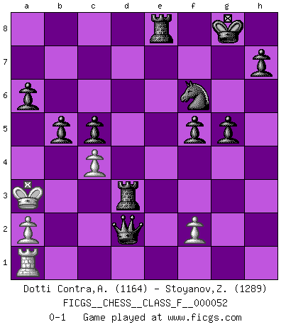 Last move : 0-1 2008 March 18 20:58:13 [Event "FICGS__CHESS__CLASS_F__000052"] [Site "FICGS"] [Date "2008.01.01"] [Round "1"] [White "Dotti Contra,Alessandro"] [Black "Stoyanov,Zdravko"] [Result "0-1"] [WhiteElo "1164"] [BlackElo "1289"] 1.e4 e5 2.Nf3 d6 3.Nc3 Bg4 4.Be2 Nc6 5.Nd5 a6 6.h3 Be6 7.d4 exd4 8.Bg5 f6 9.Bh4 g5 10.Bg3 Bg7 11.Nxd4 Nxd4 12.Qxd4 c5 13.Qc3 Bxd5 14.exd5 Qe7 15.b4 f5 16.Bxd6 Bxc3+ 17.Kd1 Qxd6 18.Rb1 Qxd5+ 19.Bd3 Bxb4 20.Ra1 Qxg2 21.Re1+ Bxe1 22.Kxe1 Qxh3 23.Ke2 Nf6 24.Rb1 b5 25.c4 O-O 26.Ra1 Rfe8+ 27.Kd2 Rad8 28.Kc2 Qxd3+ 29.Kb2 Qd2+ 30.Ka3 Rd3+ 0-1 Philidor's defense Kingside Castling by player Black (move 25) Player Black won this chess game. Follow this game move after move (download)Nowadays, when you're not a grandmaster at 14, you can forget about it. (Anand Viswanathan) Das Schach ist nichts für kleine Geister, es beansprucht einen vollen Mann, der sich nicht sklavisch an das Überlieferte hält, sondern selbständig die Tiefen des Spiels zu ergründen sucht. (Wilhelm Steinitz) La batalla por la última verdad nunca sera ganada. Y es por eso que el Ajedrez es tan fascinante. (Hans Kmoch) Les Cavaliers se révèlent fort utiles dans les positions fermées. D'habitude, les Fous sont un peu plus forts que les Cavaliers dans les positions ouvertes. Qu'on le veuille ou non, il restera toujours des exceptions ! Fear is the path to the dark side. Fear leads to anger; anger leads to hate; hate leads to suffering. I sense much fear in you. (Master Yoda in Star Wars ep.1)