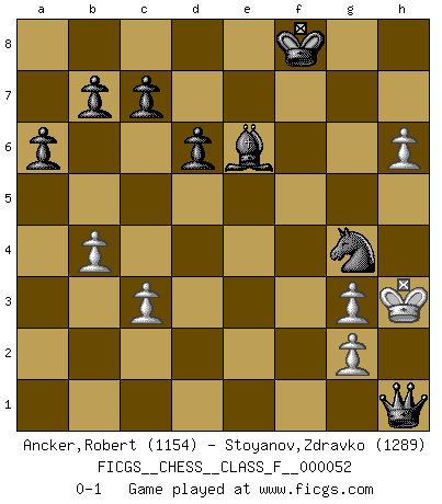 Last move : 0-1 2008 May 1 21:47:1 [Event "FICGS__CHESS__CLASS_F__000052"] [Site "FICGS"] [Date "2008.01.01"] [Round "1"] [White "Ancker,Robert"] [Black "Stoyanov,Zdravko"] [Result "0-1"] [WhiteElo "1154"] [BlackElo "1289"] 1.e4 e5 2.Bc4 d6 3.Bxf7+ Kxf7 4.Qf3+ Nf6 5.d3 h6 6.Nh3 Nc6 7.c3 Be6 8.O-O g5 9.b4 a6 10.Nxg5+ hxg5 11.Bxg5 Be7 12.Bxf6 Bxf6 13.Nd2 Qg8 14.Qg3 Qh7 15.Nf3 Rag8 16.Ng5+ Rxg5 17.h4 Rxg3 18.fxg3 Ke7 19.Rae1 Bxa2 20.Rf5 Be6 21.Rxf6 Kxf6 22.Rf1+ Ke7 23.d4 Qxe4 24.dxe5 Rf8 25.Rf4 Qe3+ 26.Kh2 Nxe5 27.Rxf8 Kxf8 28.h5 Qe1 29.h6 Ng4+ 30.Kh3 Qh1+ 0-1 Bishop's Opening Kingside Castling by player White (move 8) Player Black won this chess game. Follow this game move after move (download)Kasparov : J'adoube , Ivanchuk : S'il vous plaît ! (Garry Kasparov & Vassily Ivanchuk, Linares 1997) Ich brauche nur einen Blick auf das Schachbrett zu werfen, und weiß schon, was in der Stellung steckt, was geschehen kann und was geschehen wird. Alle übrigen suchen und prüfen, ich aber weiß es! (José Raúl Capablanca) El jugador de combinación piensa hacia adelante; comienza de la posición dada y trabaja las movidas contundentes en su mente. (Emanuel Lasker) Même si l'adversaire joue le coup analysé précédemment, recommencez l'analyse en voyant la nouvelle position. Première règle de Blumenfeld An expert is a man who has made all the mistakes which can be made in a very narrow field. (Niels Bohr)