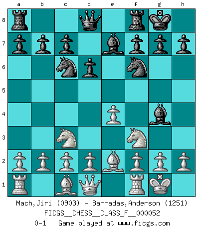 Last move : 0-1 2008 February 20 13:52:33 [Event "FICGS__CHESS__CLASS_F__000052"] [Site "FICGS"] [Date "2008.01.01"] [Round "1"] [White "Mach,Jiri"] [Black "Barradas,Anderson"] [Result "0-1"] [WhiteElo "0903"] [BlackElo "1251"] 1.e4 e5 2.Nf3 Nf6 3.Nxe5 d6 4.Nf3 Bg4 5.Nc3 Nc6 6.Be2 Be7 7.O-O O-O 0-1 This chess game has been lost on time (started : 2008.01.01 22:36:6) Petrov's defense Kingside Castling by player White (move 7) Kingside Castling by player Black (move 7) Player Black won this chess game. Follow this game move after move (download)The laws of Chess do not permit a free choice: you have to move whether you like it or not. (Emanuel Lasker) Schach ist Krieg, im Schach geht es um testosterongesteuerte Urschreie. (Garry Kasparov) En el Ajedrez, cuando menos, el valiente hereda la tierra. (Edmar Mednis) Les Echecs ne sont pas pour les âmes timides. Ils requièrent un homme entier, qui ne s'arrête pas aveuglément à ce qui a été déjà établi, mais qui tente individuellement de sonder les profondeurs du jeu. (W. Steinitz) Life is verb, not a noun. (Charlotte Perkins Gilman)