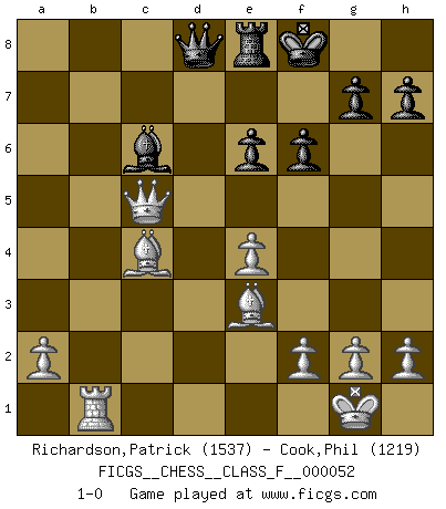 Last move : 1-0 2008 February 4 14:0:30 [Event "FICGS__CHESS__CLASS_F__000052"] [Site "FICGS"] [Date "2008.01.01"] [Round "1"] [White "Richardson,Patrick"] [Black "Cook,Phil"] [Result "1-0"] [WhiteElo "1537"] [BlackElo "1219"] 1.d4 Nf6 2.c4 e6 3.Nc3 Bb4 4.Qc2 d5 5.cxd5 Nxd5 6.e4 Nxc3 7.bxc3 Ba5 8.Nf3 c5 9.Bg5 f6 10.Be3 O-O 11.Bc4 cxd4 12.Nxd4 Qe7 13.O-O Bd7 14.Qb3 Re8 15.Qxb7 Bxc3 16.Qxa8 Bxa1 17.Rxa1 Kf8 18.Rb1 Qd8 19.Qxa7 Nc6 20.Nxc6 Bxc6 21.Qc5+ 1-0 Nimzo-Indian : Classical, Noa variation Kingside Castling by player Black (move 10) Kingside Castling by player White (move 13) Player White won this chess game. Follow this game move after move (download)Chess is like war on a board. (Bobby Fischer) Es gibt nur zwei wahre Schachgenies - das andere war Wilhelm Steinitz, der Weltmeister von 1872 bis 1894. (Robert James Fischer) El Ajedrez es el gimnasio de la mente. (Blaise Pascal) C'est une question de caractère, Beaucoup de gens perdent leur motivation très vite. D'autres, ils sont rares, peuvent la conserver très longtemps. J'aime les échecs, encore aujourd'hui je suis heureux d'analyser des parties. J'aime toujours gagner, je déteste encore perdre. Bien jouer est important pour mon intégrité intellectuelle et morale. Et puis les échecs vivent en ce moment une période historique grâce à Internet. Ils se développent dans les systèmes éducatifs à travers le monde. Ils sortent de leur ghetto, et c'est mon rôle de mener à bien cette révolution. (Gary Kasparov) The next best thing to gambling and winning is gambling and loosing. (Nick Dandalos)