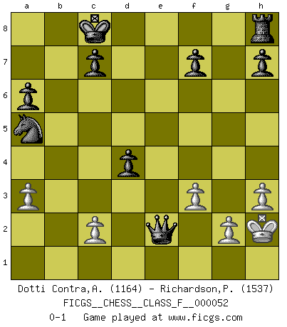 Last move : 0-1 2008 April 18 19:13:18 [Event "FICGS__CHESS__CLASS_F__000052"] [Site "FICGS"] [Date "2008.01.01"] [Round "1"] [White "Dotti Contra,Alessandro"] [Black "Richardson,Patrick"] [Result "0-1"] [WhiteElo "1164"] [BlackElo "1537"] 1.e4 Nf6 2.Nc3 d5 3.d3 dxe4 4.d4 Nc6 5.Be3 Qd6 6.Bb5 a6 7.Ba4 b5 8.Bb3 b4 9.d5 Na5 10.Ba4+ Bd7 11.Bxd7+ Qxd7 12.Nge2 bxc3 13.Nxc3 e6 14.O-O exd5 15.Bd4 O-O-O 16.b4 Bxb4 17.a3 Bxc3 18.Rb1 Qc6 19.Bxf6 Qxf6 20.Qg4+ Qe6 21.Qg3 d4 22.f3 e3 23.Qxg7 Rdg8 24.Qxh8 Rxh8 25.h3 e2 26.Rfe1 Bxe1 27.Rxe1 Qe3+ 28.Kh2 Qf2 29.Rxe2 Qxe2 0-1 Alekhine's defense : Scandinavian variation Kingside Castling by player White (move 14) Queenside Castling by player Black (move 15) Player Black won this chess game. Follow this game move after move (download)The passed pawn is a criminal, who should be kept under lock and key. Mild measures, such as police surveillance, are not sufficient. (Nimzovitch) Wenn ich mich einlogge, glauben die Leute gewöhnlich nicht, dass ich es selbst bin und sie fangen an, mir dumme Fragen zu stellen. Und wenn sie es glauben, stellen sie wieder andere dumme Fragen. (Judith Polgar) Fischer sacrificó virtualmente todo lo que la mayoría de nosotros los 'debiles' (término que él usa) valoramos, respetamos y apreciamos por el amor de un astuto, a menudo hermoso tablero de juego, por el privilegio ambivalente de ser su mas grande maestro. (Paul Kollar) Fischer est le meilleur joueur du monde et Karpov n'est qu'un joueur de bistrot. (Garry Kasparov, agé de 16 ans) The Internet is the world's largest library. It's just that all the books are on the floor. (John Allen Paulos)