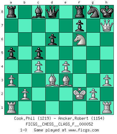 Last move : 1-0 2008 February 12 4:22:34 [Event "FICGS__CHESS__CLASS_F__000052"] [Site "FICGS"] [Date "2008.01.01"] [Round "1"] [White "Cook,Phil"] [Black "Ancker,Robert"] [Result "1-0"] [WhiteElo "1219"] [BlackElo "1154"] 1.e4 e5 2.Nf3 Bc5 3.c3 Bxf2+ 4.Kxf2 Nf6 5.d3 O-O 6.h3 c6 7.c4 b5 8.Nxe5 d6 9.Ng4 Qb6+ 10.Be3 c5 11.Nxf6+ gxf6 12.Nc3 Kh8 13.Nd5 Qd8 14.a3 bxc4 15.dxc4 a5 16.Bd3 Nc6 17.Qh5 Ne7 18.Nxf6 Ng8 19.Qxh7+ 1-0 King's knight Opening Kingside Castling by player Black (move 5) Player White won this chess game. Follow this game move after move (download)You know, comrade Pachman, I don't enjoy being a Minister, I would rather play Chess like you. (Che Guevara) Das Zentrum ist der Balkan des Schachbretts - Kriegshandlungen können in jedem Moment ausbrechen. (Aaron Nimzowitsch) Aún el Rey más flojo huye despavorido ante la amenaza de un Jaque doble. (Aaron Nimzowitsch) Il s'avisa de me proposer d'apprendre les échecs qu'il jouait un peu... me voilà forcené des échecs. J'achète un échiquier, je m'enferme dans ma chambre, j'y passe des jours et des nuits à vouloir apprendre par cur toutes les parties. (Jean-Jacques Rousseau, Confessions) Just because you do not take an interest in politics doesn't mean politics won't take an interest in you. (Pericles 430 B.C.)
