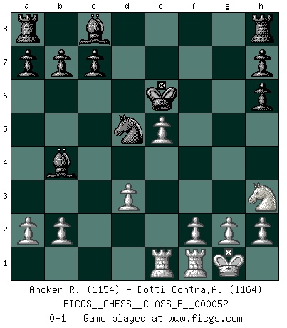 Last move : 0-1 2008 April 23 4:3:3 [Event "FICGS__CHESS__CLASS_F__000052"] [Site "FICGS"] [Date "2008.01.01"] [Round "1"] [White "Ancker,Robert"] [Black "Dotti Contra,Alessandro"] [Result "0-1"] [WhiteElo "1154"] [BlackElo "1164"] 1.e4 Nc6 2.Bc4 Nh6 3.d3 e5 4.Bxh6 gxh6 5.Bxf7+ Kxf7 6.Qh5+ Kg7 7.Nh3 Nd4 8.O-O d5 9.Qxe5+ Qf6 10.Qxf6+ Kxf6 11.Nc3 Nxc2 12.Rac1 Nb4 13.Nxd5+ Nxd5 14.e5+ Ke6 15.Rce1 Bb4 0-1 This chess game has been lost on time (started : 2008.01.01 22:36:6) KP : Nimzovich defense Kingside Castling by player White (move 8) Player Black won this chess game. Follow this game move after move (download)I believe that Chess possesses a magic that is also a help in advanced age. A rheumatic knee is forgotten during a game of Chess and other events can seem quite unimportant in comparison with a catastrophe on the chessboard. (Vlastimil Hort) Ich bewundere Kasparows phantasievolle Angriffssiege aus den Achtzigern und Neunzigern, aber wenn man sie mit dem Computer überprüft, nimmt der Computer in jeder zweiten Partie die Opfer an, verteidigt sich und gewinnt. (Vladimir Kramnik) Ciertamente, de todas la drogas del mundo, el Ajedrez debe ser el mas placentero permamentemente. (Assiac) Un journaliste : 'Vous préférez avoir une dame de plus sur l'échiquier ou au lit ?' Boris Spassky : 'Ca dépend de la position.' Panic is a sudden desertion of us, an a going over to the enemy of our imagination. (Christian Nevell Bovee)