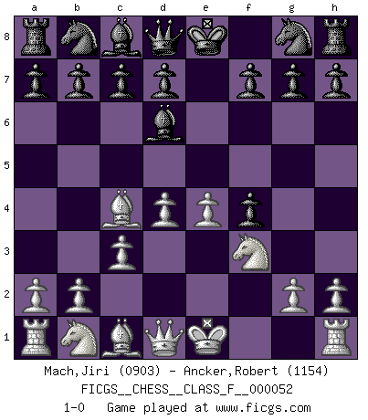 Last move : 1-0 2008 March 28 5:16:33 [Event "FICGS__CHESS__CLASS_F__000052"] [Site "FICGS"] [Date "2008.01.01"] [Round "1"] [White "Mach,Jiri"] [Black "Ancker,Robert"] [Result "1-0"] [WhiteElo "0903"] [BlackElo "1154"] 1.e4 e5 2.f4 exf4 3.Nf3 Bc5 4.d4 Bb4+ 5.c3 Bd6 6.Bc4 1-0 This chess game has been lost on time (started : 2008.01.01 22:36:6) King's knight's gambit Player White won this chess game. Follow this game move after move (download)With or without the title, Bobby Fischer was unquestionably the greatest player of his time. (Burt Hochberg) Man braucht nicht immer den besten Zug zu spielen: Ein Zug muß aktiv, unternehmungslustig, korrekt und schön sein. (David Bronstein) ¿Esta Bobby Fischer algo cuerdo?. (Salo Flohr) Toutes les manuvres exécutées sur une colonne ouverte ont pour but ultime l'intrusion définitive sur la septième ou la huitième rangée, en plein cur de la position ennemie. (Aaron Nimzovitch) If you ain't just a little scared when you enter a casino, you are either very rich or you haven't studied the games enough. (Pappy)