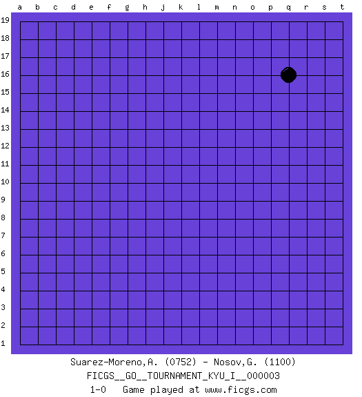 Last move : 1-0 2008 February 2 0:21:20 [Event "FICGS__GO__TOURNAMENT_KYU_I__000003"] [Site "FICGS"] [Date "2008.01.02"] [Round "1"] [Black "Suarez-Moreno,Alejandro"] [White "Nosov,Gleb"] [Result "1-0"] [Rating 1 "0752"] [Rating 2 "1100"] 1.q16 1-0 This go game has been lost on time (started : 2008.01.02 5:38:0) Here are the names of the openings (joseki) played in the four corners : Player Black won this Go (weiqi, baduk) game. Follow this game move after move (download)At the head of two stones in a row, play hane. (Anonymous) There is a very easy way to return from a casino with a small fortune : go there with a large one. (Jack Yelton)