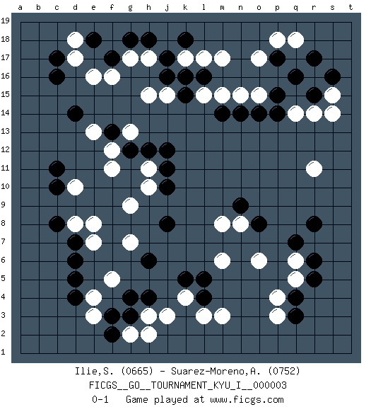 Last move : 0-1 2008 May 10 9:32:18 [Event "FICGS__GO__TOURNAMENT_KYU_I__000003"] [Site "FICGS"] [Date "2008.01.02"] [Round "1"] [Black "Ilie,Sebastian"] [White "Suarez-Moreno,Alejandro"] [Result "0-1"] [Rating 1 "0665"] [Rating 2 "0752"] 1.q16 e16 2.d4 o17 3.q4 r14 4.p15 r16 5.r17 q18 6.r15 o15 7.o14 n15 8.n14 l15 9.m14 m15 10.c16 d17 11.c17 r11 12.r8 q14 13.p14 s15 14.s16 s14 15.p17 p18 16.j17 h15 17.f17 k17 18.k18 g17 19.g18 h17 20.h18 f16 21.e18 d18 22.d14 e3 23.g3 e4 24.d5 j3 25.h4 h3 26.g4 g2 27.f2 h2 28.f3 f5 29.h6 m3 30.d7 p3 31.q3 q6 32.r6 q5 33.r5 p4 34.q7 o6 35.o8 d10 36.c11 e8 37.c10 d8 38.c8 e7 39.d6 g7 40.k5 k4 41.l5 m6 42.j8 g9 43.j10 h10 44.j11 h11 45.j12 n8 46.n9 m8 47.l4 l3 48.h12 f11 49.j16 j15 50.k16 l17 51.l16 m17 52.k15 g13 53.g12 f12 54.f13 e13 0-1 This go game has been lost on time (started : 2008.01.02 5:38:0) Here are the names of the openings (joseki) played in the four corners : Corner q16 : q16 o17 Hoshi (Hwajeom, Seongjeom, Xingwei`) 4-4 Point. The star or hoshi (4-4) point, emphasizing influence at the potential expense of territory. Ikken Kakari (Hankan Keolch'im, Yi Gua`jiao~, 1-Space Low Approach). White 2 is the standard approach move to the 4-4. Corner d16 : e16 c16 Takamoku (Gomok, Gaomu`) 5-4 Point. The takamoku (high) point (5-4). With its emphasis on influence, the 5-4 point complements the 4-4 (hoshi) point in creating an influence-oriented fuseki. Komoku. White responds with 3-3, 3-5, 4-6, 4-7, 3-6, 3-7. Corner d4 : d4 e3 Hoshi (Hwajeom, Seongjeom, Xingwei`) 4-4 Point. The star or hoshi (4-4) point, emphasizing influence at the potential expense of territory. Player White won this Go (weiqi, baduk) game. Follow this game move after move (download)Play slow, win slow; play fast, lose fast. (Anonymous) They misunderestimated me. (George W. Bush, Bentonville nov. 6, 2000)