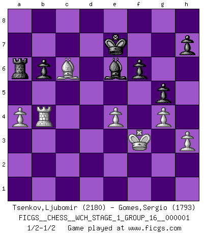 Last move : 1/2-1/2 2006 August 20 20:33:57 [Event "FICGS__CHESS__WCH_STAGE_1_GROUP_16__000001"] [Site "FICGS"] [Date "2006.07.01"] [Round "1"] [White "Tsenkov,Ljubomir"] [Black "Gomes,Sergio"] [Result "1/2-1/2"] [WhiteElo "2180"] [BlackElo "1793"] 1.c4 e5 2.Nc3 Nf6 3.Nf3 Nc6 4.g3 Bb4 5.Bg2 O-O 6.Nd5 Bc5 7.O-O d6 8.e3 Bg4 9.h3 Bh5 10.g4 Bg6 11.d4 Bb6 12.dxe5 Nxe5 13.Nxe5 dxe5 14.Nxb6 axb6 15.Bxb7 Rb8 16.Qxd8 Rfxd8 17.Bg2 Bd3 18.Re1 Bxc4 19.b3 Bd5 20.e4 Be6 21.f4 Ra8 22.fxe5 Nd7 23.Bg5 Rdc8 24.Bf4 c5 25.Bf1 Nf8 26.Bd2 c4 27.bxc4 Ng6 28.Reb1 Nxe5 29.Bf4 Nxc4 30.Rb4 f6 31.a4 Rc5 32.Rd1 g5 33.Bd6 Rc6 34.Bh2 Ne3 35.Bb5 Rc2 36.Re1 Rg2+ 37.Kh1 Rxh2+ 38.Kxh2 Nc2 39.Reb1 Nxb4 40.Rxb4 Kf7 41.Bc6 Ra6 42.Kg3 Ke7 43.Kf3 1/2-1/2 English Opening Kingside Castling by player Black (move 5) Kingside Castling by player White (move 7) This chess game ended in a draw. Follow this game move after move (download)I am still a victim of Chess. It has all the beauty of art and much more. It cannot be commercialized. Chess is much purer than art in its social position. (Marcel Duchamp) Rauchen ist dem Schachspieler bei seiner Arbeit, also im Wettkampf, untersagt. (Viktor Kortschnoi) El Ajedrez es imaginación. (David Bronstein) La victoire dans une partie d'Echecs appartient la plupart du temps à celui qui voit un peu plus loin que l'adversaire. (Lasker) Remember : Your focus determines your reality. (Qui-Gon Jinn in Star Wars ep.1)