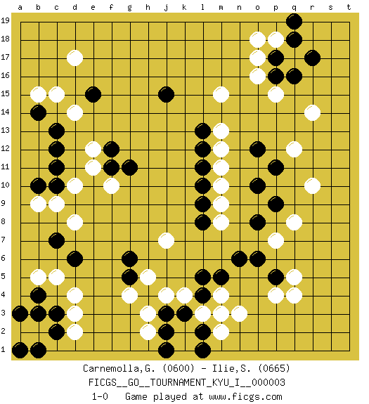 Last move : 1-0 2008 May 5 21:13:32 [Event "FICGS__GO__TOURNAMENT_KYU_I__000003"] [Site "FICGS"] [Date "2008.01.02"] [Round "1"] [Black "Carnemolla,Giampaolo"] [White "Ilie,Sebastian"] [Result "1-0"] [Rating 1 "0600"] [Rating 2 "0665"] 1.q16 d17 2.p5 d4 3.k3 o17 4.o10 q4 5.j15 r14 6.r17 p15 7.p17 p18 8.p16 o16 9.q18 o18 10.q19 d10 11.c7 c5 12.c3 d3 13.c2 d2 14.b4 b5 15.a3 b2 16.b1 a2 17.b3 q5 18.a1 n3 19.c13 c15 20.e15 d14 21.c10 c9 22.c11 b9 23.b10 d8 24.d6 g4 25.g5 h5 26.g6 j4 27.j3 h3 28.j2 m4 29.n6 p7 30.p9 q8 31.o8 r10 32.p11 q12 33.o12 j7 34.l5 k4 35.l4 l3 36.l2 m3 37.m5 h2 38.j1 m2 39.l1 p4 40.o6 m8 41.l8 m9 42.l9 m10 43.l10 m11 44.l11 m12 45.l12 m13 46.l13 m15 47.b14 b15 48.c12 e12 49.f12 e11 50.f11 f10 51.g11 1-0 This go game has been lost on time (started : 2008.01.02 5:38:0) Here are the names of the openings (joseki) played in the four corners : Corner q16 : q16 o17 Hoshi (Hwajeom, Seongjeom, Xingwei`) 4-4 Point. The star or hoshi (4-4) point, emphasizing influence at the potential expense of territory. Ikken Kakari (Hankan Keolch'im, Yi Gua`jiao~, 1-Space Low Approach). White 2 is the standard approach move to the 4-4. Corner q4 : p5 q4 Go-no-go (Wu~wu~) 5-5 Point. The 5-5 was experimented with briefly during the "New Fuseki" movement in Japan in the 1930s. The 5-5 point has not retained popularity because the 4-4 hoshi (star) point strikes a better balance between influence and territory. As one can see from the variations, though, the 5-5 is playable. Corner d16 : d17 j15 Komoku (Somok, Xiao~mu`) 3-4 Point. The komoku (3-4) point is the traditional corner enclosure move.. Corner d4 : d4 c7 Hoshi (Hwajeom, Seongjeom, Xingwei`) 4-4 Point. The star or hoshi (4-4) point, emphasizing influence at the potential expense of territory. Nikken Kakari (Dukan Keolch'im, E`r Gua`jiao~, 2-Space Low Approach). White typically answers by 7-3 or 3-5 (which is not joseki). Player Black won this Go (weiqi, baduk) game. Follow this game move after move (download)Be a little patient. Keshi works ! (Anonymous) He who fights with monsters should be careful lest he thereby become a monster. (Friedrich Nietzsche, Beyond Good and Evil)