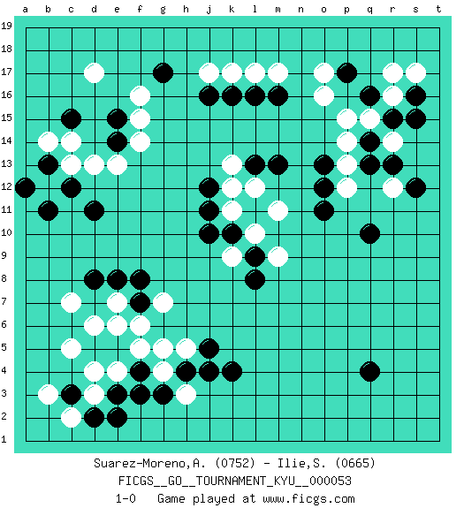 Last move : 1-0 2008 May 5 21:13:32 [Event "FICGS__GO__TOURNAMENT_KYU__000053"] [Site "FICGS"] [Date "2008.01.02"] [Round "1"] [Black "Suarez-Moreno,Alejandro"] [White "Ilie,Sebastian"] [Result "1-0"] [Rating 1 "0752"] [Rating 2 "0665"] 1.q16 d17 2.q4 d4 3.c15 c13 4.e15 f16 5.d11 e13 6.d8 f15 7.f4 d6 8.f7 e7 9.e8 f6 10.e5 e6 11.d5 c5 12.k4 g4 13.g3 e4 14.h4 g5 15.e3 f5 16.f3 h5 17.j5 g7 18.f8 c7 19.c3 d3 20.d2 h3 21.j4 c2 22.e2 b3 23.q10 o17 24.p17 o16 25.m16 q15 26.r15 p15 27.q14 r14 28.r13 r16 29.s15 r17 30.s16 s17 31.e14 f14 32.b13 b12 33.c12 d13 34.b11 b14 35.a12 c14 36.j16 l17 37.l16 k17 38.k16 m17 39.g17 j17 40.k10 k13 41.m13 l12 42.l13 k11 43.j12 k12 44.j11 l10 45.l9 k9 46.j10 m9 47.l8 m11 48.o13 p14 49.q13 p13 50.o11 p12 51.o12 r12 52.s12 1-0 This go game has been lost on time (started : 2008.01.02 6:23:47) Here are the names of the openings (joseki) played in the four corners : Corner d16 : d17 c15 Komoku (Somok, Xiao~mu`) 3-4 Point. The komoku (3-4) point is the traditional corner enclosure move.. Ikken Kakari (Hankan Keolch'im, Yi Gua`jiao~, 1-Space Low Pincer). The small knight move is the basic approach move to the 3-4 point stone. It has been continually used for over four centuries. There are limitless variations, with new moves constantly being discovered. Black 2 opens the door to a treaure store of joseki. Corner d4 : d4 d8 Hoshi (Hwajeom, Seongjeom, Xingwei`) 4-4 Point. The star or hoshi (4-4) point, emphasizing influence at the potential expense of territory. Corner q16 : q16 o17 Hoshi (Hwajeom, Seongjeom, Xingwei`) 4-4 Point. The star or hoshi (4-4) point, emphasizing influence at the potential expense of territory. Ikken Kakari (Hankan Keolch'im, Yi Gua`jiao~, 1-Space Low Approach). White 2 is the standard approach move to the 4-4. Player Black won this Go (weiqi, baduk) game. Follow this game move after move (download)Capture what you cut off. (Anonymous) There is a great deal of difference between an eager man who wants to read a book and a tired man who wants a book to read. (G.K. Chesterton)