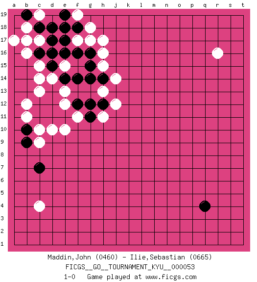 Last move : 1-0 2008 April 27 8:46:7 [Event "FICGS__GO__TOURNAMENT_KYU__000053"] [Site "FICGS"] [Date "2008.01.02"] [Round "1"] [Black "Maddin,John"] [White "Ilie,Sebastian"] [Result "1-0"] [Rating 1 "0460"] [Rating 2 "0665"] 1.q4 r16 2.d16 c4 3.c7 f17 4.d18 b16 5.b17 c17 6.d17 b18 7.c18 a17 8.c16 b17 9.b19 c15 10.d15 c14 11.c12 d14 12.f16 g17 13.g16 h17 14.f18 g18 15.e17 f19 16.e18 e15 17.e16 h16 18.g14 h15 19.g15 e12 20.e14 e13 21.f14 h13 22.e19 c19 23.d13 b12 24.c11 b11 25.b10 c13 26.d12 c10 27.d11 c9 28.b9 e10 29.h14 j14 30.e11 f11 31.f12 d10 32.g12 h11 33.h12 j12 34.g11 1-0 This go game has been lost on time (started : 2008.01.02 6:23:47) Here are the names of the openings (joseki) played in the four corners : Corner d4 : c4 c7 Komoku (Somok, Xiao~mu`) 3-4 Point. The komoku (3-4) point is the traditional corner enclosure move.. Corner d16 : d16 f17 Hoshi (Hwajeom, Seongjeom, Xingwei`) 4-4 Point. The star or hoshi (4-4) point, emphasizing influence at the potential expense of territory. Ikken Kakari (Hankan Keolch'im, Yi Gua`jiao~, 1-Space Low Approach). White 2 is the standard approach move to the 4-4. Player Black won this Go (weiqi, baduk) game. Follow this game move after move (download)Don't defend - extend ! (Bill Taylor) Beta. Software undergoes beta testing shortly before it's released. Beta is latin for still doesn't work. (Anonymous)