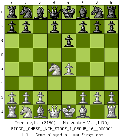 Last move : 1-0 2006 August 6 15:59:13 [Event "FICGS__CHESS__WCH_STAGE_1_GROUP_16__000001"] [Site "FICGS"] [Date "2006.07.01"] [Round "1"] [White "Tsenkov,Ljubomir"] [Black "Malvankar,Vikrant"] [Result "1-0"] [WhiteElo "2180"] [BlackElo "1470"] 1.e4 c5 2.Nf3 e6 3.d4 cxd4 4.Nxd4 1-0 This chess game has been lost on time (started : 2006.07.01 16:22:3) Sicilian defense Player White won this chess game. Follow this game move after move (download)A passed Pawn increases in strength as the number of pieces on the board diminishes. (Capablanca) Kasparov ist eine Art Monster mit hundert Augen, denen auch nicht das Geringste entgeht. (Tony Miles) La señal de un Gran Maestro es su habilidad de ganar una partida rápidamente y sin dolor. (Irving Chernev) L'action d'une oeuvre littéraire se déroule sur un champ de bataille. Les masques et les types du drame moderne correspondent aux pièces du jeu d'échecs. L'intrigue correspond aux coups et aux gambits, c'est à dire aux techniques du jeu telles qu'utilisées et interprétées par les joueurs. Les tactiques et les péripéties [mouvements] correspondent aux coups exécutés par l'adversaire. (Viktor Shklovsky) Macintosh - we might not get everything right, but at least we knew the century was going to end. (Douglas Adams)