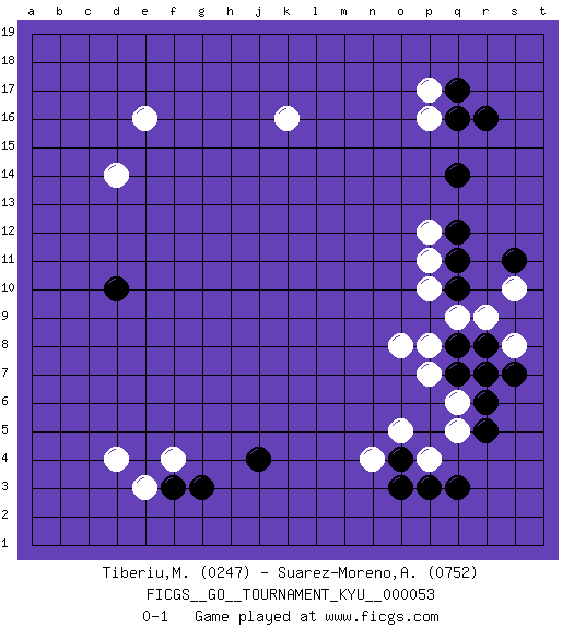 Last move : 0-1 2008 March 11 15:54:56 [Event "FICGS__GO__TOURNAMENT_KYU__000053 "] [Site "FICGS"] [Date "2008.01.02"] [Round "1"] [Black "Tiberiu,Maran "] [White "Suarez-Moreno,Alejandro "] [Result "0-1"] [Rating 1 "0247"] [Rating 2 "0752"] 1.q3 d4 2.r16 e16 3.f3 e3 4.j4 f4 5.g3 p16 6.q17 p17 7.q16 q5 8.q7 o5 9.o4 p4 10.p3 q9 11.q11 o8 12.r8 r9 13.r5 n4 14.o3 q6 15.r6 p7 16.q8 s8 17.s7 p8 18.r7 s10 19.s11 p10 20.q10 p11 21.q12 p12 22.q14 k16 23.d10 d14 0-1 This go game has been lost on time (started : 2008.01.02 6:23:47) Here are the names of the openings (joseki) played in the four corners : Corner d4 : d4 f3Hoshi (Hwajeom, Seongjeom, Xingwei`) 4-4 Point. The star or hoshi (4-4) point, emphasizing influence at the potential expense of territory.Ikken Kakari (Hankan Keolch'im, Yi Gua`jiao~, 1-Space Low Approach). Black 2 is the standard approach move to the 4-4. Corner q16 : r16 p16Komoku (Somok, Xiao~mu`) 3-4 Point. The komoku (3-4) point is the traditional corner enclosure move..Ikken Takagakari (Hankan Nop'dakeolch'im, Yi Gaogua`jiao~, 1-Space High Approach). The 5-4 approach move has become more popular in modern times, as modern Go emphasizes speed and influence. Corner q4 : q3 q5Komoku (Somok, Xiao~mu`) 3-4 Point. The komoku (3-4) point is the traditional corner enclosure move..Ikken Takagakari (Hankan Nop'dakeolch'im, Yi Gaogua`jiao~, 1-Space High Approach). The 5-4 approach move has become more popular in modern times, as modern Go emphasizes speed and influence. Player White won this Go (weiqi, baduk) game.Follow this game move after move (download ) Keshi is worth as much as an invasion ! (Anonymous) I would love to change the world, but they won't give me the source code. (Unknown)