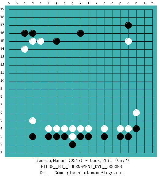 Last move : 0-1 2008 March 6 3:15:1 [Event "FICGS__GO__TOURNAMENT_KYU__000053 "] [Site "FICGS"] [Date "2008.01.02"] [Round "1"] [Black "Tiberiu,Maran "] [White "Cook,Phil "] [Result "0-1"] [Rating 1 "0247"] [Rating 2 "0577"] 1.c16 c14 2.q17 q15 3.d3 d5 4.r4 r6 5.l3 k4 6.k3 h4 7.h3 j3 8.j2 j4 9.g3 g4 10.f3 f4 11.k16 p4 12.q3 q4 13.p3 n4 14.n3 l4 15.g15 d15 16.d16 e15 0-1 This go game has been lost on time (started : 2008.01.02 6:23:47) Here are the names of the openings (joseki) played in the four corners : Corner d16 : c16 c14Komoku (Somok, Xiao~mu`) 3-4 Point. The komoku (3-4) point is the traditional corner enclosure move.. Corner q16 : q17 q15Komoku (Somok, Xiao~mu`) 3-4 Point. The komoku (3-4) point is the traditional corner enclosure move..Ikken Takagakari (Hankan Nop'dakeolch'im, Yi Gaogua`jiao~, 1-Space High Approach). The 5-4 approach move has become more popular in modern times, as modern Go emphasizes speed and influence. Corner d4 : d3 d5Komoku (Somok, Xiao~mu`) 3-4 Point. The komoku (3-4) point is the traditional corner enclosure move..Ikken Takagakari (Hankan Nop'dakeolch'im, Yi Gaogua`jiao~, 1-Space High Approach). The 5-4 approach move has become more popular in modern times, as modern Go emphasizes speed and influence. Corner q4 : r4 r6Komoku (Somok, Xiao~mu`) 3-4 Point. The komoku (3-4) point is the traditional corner enclosure move.. Player White won this Go (weiqi, baduk) game.Follow this game move after move (download ) Empty triangles are bad. (Anonymous) Ah, the Socrating method. The best way we have of teaching everything-apart from juggling chainsaws. (Gregory House, House M.D.)