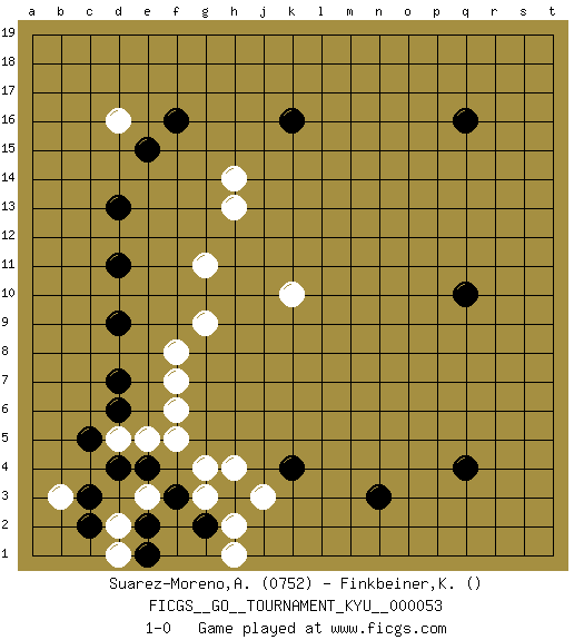 Last move : 1-0 2008 February 6 5:46:54 [Event "FICGS__GO__TOURNAMENT_KYU__000053"] [Site "FICGS"] [Date "2008.01.02"] [Round "1"] [Black "Suarez-Moreno,Alejandro"] [White "Finkbeiner,Kirk"] [Result "1-0"] [Rating 1 "0752"] 1.q16 d16 2.q4 k10 3.d4 f5 4.f3 e3 5.e4 b3 6.c3 h2 7.h3 g3 8.g2 g4 9.e2 d2 10.c2 d1 11.e1 h1 12.n3 j3 13.k4 h4 14.d6 f7 15.d9 g9 16.d13 f6 17.q10 g11 18.k16 h13 19.f16 d5 20.c5 e5 21.d7 f8 22.d11 h14 23.e15 1-0 Here are the names of the openings (joseki) played in the four corners : Corner d4 : d4 f5 Hoshi (Hwajeom, Seongjeom, Xingwei`) 4-4 Point. The star or hoshi (4-4) point, emphasizing influence at the potential expense of territory. Corner d16 : d16 d13 Hoshi (Hwajeom, Seongjeom, Xingwei`) 4-4 Point. The star or hoshi (4-4) point, emphasizing influence at the potential expense of territory. Nikken Takagakari (Dukan Nop'dakeolch'im, E`r Gaojia, 2-Space High Approach). Black 2 is a light approach move. Rarely played in even games, Black 2 is typically employed in handicap games. White continues with 6-4 or 3-10. In Korean Sunjang Baduk White has a stone on 8-4. Player Black won this Go (weiqi, baduk) game. Follow this game move after move (download)The enemy's vital point is your own. (Anonymous) Luck is the residue of design. (John Milton)