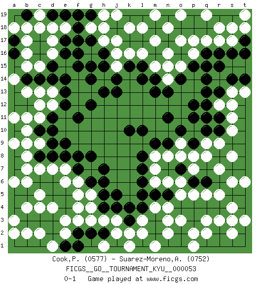 Last move : 0-1 2008 July 18 17:18:37 [Event "FICGS__GO__TOURNAMENT_KYU__000053"] [Site "FICGS"] [Date "2008.01.02"] [Round "1"] [Black "Cook,Phil"] [White "Suarez-Moreno,Alejandro"] [Result "0-1"] [Rating 1 "0577"] [Rating 2 "0752"] 1.r16 p16 2.q15 q17 3.q4 d16 4.d10 d4 5.d6 f3 6.d14 f17 7.h16 l16 8.l14 h14 9.g15 j16 10.h15 j15 11.j13 h17 12.f16 e15 13.g14 o3 14.o4 n4 15.p3 o5 16.p4 n3 17.h13 p7 18.o2 n2 19.n1 m1 20.o1 l2 21.j14 p2 22.q7 q8 23.p6 o6 24.p5 r7 25.q6 r9 26.o7 p8 27.n5 n6 28.m5 m4 29.l5 m6 30.j5 j3 31.l4 l3 32.e5 c5 33.k15 k16 34.l15 n16 35.n15 r17 36.s16 s17 37.t17 t18 38.t16 r18 39.p15 r12 40.p12 m8 41.l7 m7 42.l8 g5 43.g6 f6 44.h5 g4 45.f7 f5 46.e4 e3 47.m9 n8 48.n9 o9 49.o10 p10 50.p11 g7 51.h6 e7 52.f8 d7 53.c6 c7 54.b5 b4 55.a4 a3 56.a5 b6 57.h4 h3 58.q10 q9 59.p9 o8 60.r10 s10 61.e9 b10 62.b12 c11 63.e12 d12 64.e13 c13 65.c14 b15 66.b14 b13 67.a13 b11 68.c10 c9 69.d8 q2 70.k4 r3 71.r4 s4 72.s5 s2 73.t4 s3 74.k3 k2 75.c8 b8 76.d9 b9 77.e16 d17 78.e17 e18 79.g17 h18 80.f18 c18 81.d15 c15 82.d5 c4 83.r11 s11 84.r13 s13 85.s14 r14 86.q13 s6 87.r6 s8 88.e19 d18 89.d19 c19 90.f19 b17 91.r15 o15 92.q14 m15 93.m13 n14 94.n13 p10 95.q11 t6 96.p9 t13 97.o14 j17 98.m14 n15 99.d11 c12 100.a12 a11 101.e8 e6 102.q12 s12 103.q16 o17 104.g19 h19 105.t5 a14 106.l6 t3 107.g8 p1 108.f15 q3 109.e14 r5 110.g2 g3 111.f2 e2 112.e1 d1 113.f1 c2 114.h2 j2 115.j1 k1 116.s19 s18 117.t14 q5 118.p18 p17 119.o18 n18 120.n19 m19 121.m18 o19 122.p19 m17 123.n19 l18 124.a7 a6 125.a8 b7 126.a16 b16 127.a17 a18 128.b19 b18 129.k19 k18 130.b1 b2 131.a1 p10 132.n11 g18 133.f17 q19 134.r19 t19 135.q18 o19 136.c1 a2 137.h7 pass 138.p9 pass 139.k10 pass 140.l10 d13 141.f11 a9 142.g12 h1 143.p6 p5 144.q6 pass 145.pass pass 146.l19 j19 147.pass pass 148.pass pass 149.pass pass 150.pass f4 151.j4 pass 152.pass pass 153.pass pass 0-1 Here are the names of the openings (joseki) played in the four corners : Corner q16 : r16 p16 Komoku (Somok, Xiao~mu`) 3-4 Point. The komoku (3-4) point is the traditional corner enclosure move.. Ikken Takagakari (Hankan Nop'dakeolch'im, Yi Gaogua`jiao~, 1-Space High Approach). The 5-4 approach move has become more popular in modern times, as modern Go emphasizes speed and influence. Corner d4 : d4 d6 Hoshi (Hwajeom, Seongjeom, Xingwei`) 4-4 Point. The star or hoshi (4-4) point, emphasizing influence at the potential expense of territory. Ikken Takagakari (Hankan Nop'dakeolch'im, Yi Gaojia, 1-Space High Approach). White typically responds at 6-4 or 3-10. White 4-10 is played when White finds play on the right side advantageous. White 4-8 or 3-8 may be played when White has support at top. Corner d16 : d16 d14 Hoshi (Hwajeom, Seongjeom, Xingwei`) 4-4 Point. The star or hoshi (4-4) point, emphasizing influence at the potential expense of territory. Ikken Takagakari (Hankan Nop'dakeolch'im, Yi Gaojia, 1-Space High Approach). White typically responds at 6-4 or 3-10. White 4-10 is played when White finds play on the right side advantageous. White 4-8 or 3-8 may be played when White has support at top. Corner q4 : q4 o3 Hoshi (Hwajeom, Seongjeom, Xingwei`) 4-4 Point. The star or hoshi (4-4) point, emphasizing influence at the potential expense of territory. Ikken Kakari (Hankan Keolch'im, Yi Gua`jiao~, 1-Space Low Approach). White 2 is the standard approach move to the 4-4. Player White won this Go (weiqi, baduk) game. Follow this game move after move (download)Don't make territory near thickness. (Anonymous) An expert is a man who has made all the mistakes which can be made in a very narrow field. (Niels Bohr)