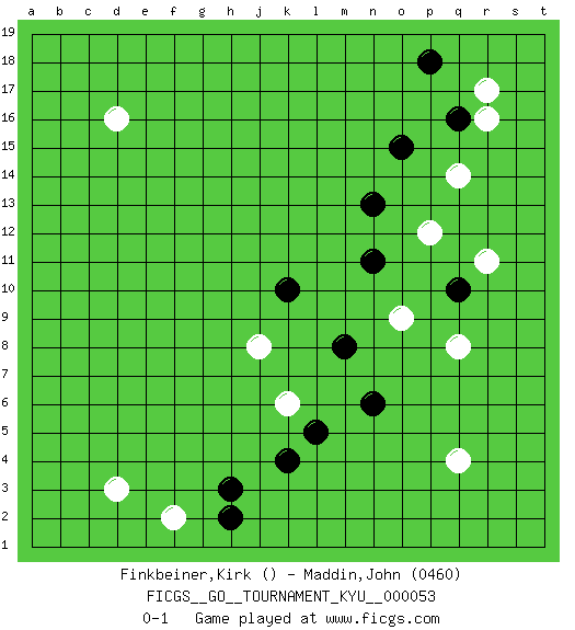 Last move : 0-1 2008 February 6 5:46:59 [Event "FICGS__GO__TOURNAMENT_KYU__000053 "] [Site "FICGS"] [Date "2008.01.02"] [Round "1"] [Black "Finkbeiner,Kirk "] [White "Maddin,John "] [Result "0-1"] [Rating 2 "0460"] 1.q16 d16 2.k10 q4 3.q10 q14 4.o15 r17 5.p18 r16 6.n13 p12 7.n11 r11 8.m8 o9 9.n6 q8 10.l5 k6 11.k4 j8 12.h3 d3 13.h2 f2 0-1 Here are the names of the openings (joseki) played in the four corners : Corner q16 : q16 q14Hoshi (Hwajeom, Seongjeom, Xingwei`) 4-4 Point. The star or hoshi (4-4) point, emphasizing influence at the potential expense of territory.Ikken Takagakari (Hankan Nop'dakeolch'im, Yi Gaojia, 1-Space High Approach). Black typically responds at 6-4 or 3-10. Black 4-10 is played when Black finds play on the right side advantageous. Black 4-8 or 3-8 may be played when Black has support at top. Corner q4 : q4 m8Hoshi (Hwajeom, Seongjeom, Xingwei`) 4-4 Point. The star or hoshi (4-4) point, emphasizing influence at the potential expense of territory. Corner d4 : j8 h3This joseki is unknown. A weak or weird move has probably been played in this corner. Player White won this Go (weiqi, baduk) game.Follow this game move after move (download ) The monkey jump is worth eight points. (Anonymous) I live to kill Traxler counterattack. (Ilmars Cirulis)