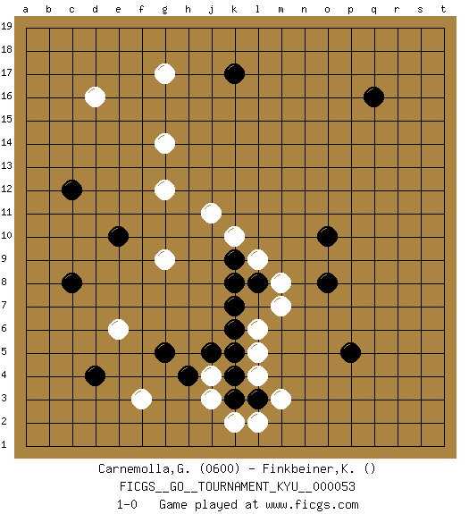 Last move : 1-0 2008 February 5 2:29:44 [Event "FICGS__GO__TOURNAMENT_KYU__000053"] [Site "FICGS"] [Date "2008.01.02"] [Round "1"] [Black "Carnemolla,Giampaolo"] [White "Finkbeiner,Kirk"] [Result "1-0"] [Rating 1 "0600"] 1.q16 d16 2.p5 k10 3.d4 e6 4.e10 g9 5.k17 g12 6.c8 f3 7.l3 g14 8.o10 g17 9.c12 j4 10.k4 l6 11.k8 m8 12.o8 l9 13.k9 j11 14.l8 m7 15.k7 l5 16.j5 k2 17.k3 m3 18.h4 j3 19.k5 l4 20.k6 l2 21.g5 1-0 Here are the names of the openings (joseki) played in the four corners : Corner d4 : d4 e6 Hoshi (Hwajeom, Seongjeom, Xingwei`) 4-4 Point. The star or hoshi (4-4) point, emphasizing influence at the potential expense of territory. Player Black won this Go (weiqi, baduk) game. Follow this game move after move (download)In the corner, five stones in a row on the third line are alive. (Anonymous) Computer Science is no more about computers than astronomy is about telescopes. (Edsger W. Dijkstra)