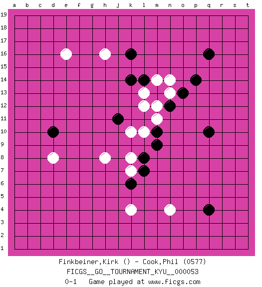 Last move : 0-1 2008 February 5 2:27:51 [Event "FICGS__GO__TOURNAMENT_KYU__000053"] [Site "FICGS"] [Date "2008.01.02"] [Round "1"] [Black "Finkbeiner,Kirk"] [White "Cook,Phil"] [Result "0-1"] [Rating 2 "0577"] 1.q16 e16 2.q10 k10 3.q4 k4 4.k16 h16 5.d10 d8 6.p14 n14 7.l14 l12 8.n12 m11 9.m13 n13 10.o13 m12 11.j11 l13 12.k14 m14 13.m10 l10 14.m9 n4 15.l7 k8 16.l8 k7 17.k6 h8 0-1 Here are the names of the openings (joseki) played in the four corners : Player White won this Go (weiqi, baduk) game. Follow this game move after move (download)In an unreasonable situation, an unreasonable move is reasonable. (Tamino) History is the quarrels of popes and kings, with wars or pestilences in every page; the men all so good for nothing, and hardly any women at all. (Jane Austen)