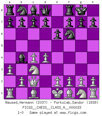 Last move : 1-0 2008 February 29 2:48:8 [Event "FICGS__CHESS__CLASS_A__000033"] [Site "FICGS"] [Date "2008.01.02"] [Round "1"] [White "Naused,Hermann"] [Black "Porkolab,Sandor"] [Result "1-0"] [WhiteElo "2037"] [BlackElo "1838"] 1.d4 Nf6 2.c4 e6 3.Nc3 Bb4 4.Qc2 O-O 5.a3 1-0 This chess game has been lost on time (started : 2008.01.02 8:27:42) Nimzo-Indian : Classical variation Kingside Castling by player Black (move 4) Player White won this chess game. Follow this game move after move (download)Do you realize Fischer almost never has any bad pieces? He exchanges them, and the bad pieces remain with his opponents. (Yuri Balashov) Ich habe die besten Aussichten, den ersten Preis zu gewinnen - denn jeder muss gegen Steinitz spielen, nur ich nicht! (Wilhelm Steinitz) Yo tuve un dolor de muelas en la primer partida. En el segundo juego, tuve un dolor de cabeza. En el tercero, tuve un ataque de reumatísmo. En la cuarta partida, no me sentía muy bien. ¿Y en el quinto juego? Bueno, ¿que acaso uno tiene que ganar todos los juegos?. (Siegbert Tarrasch) Toutes choses étant égales, c'est la conviction qui gagne. Alliée à une volonté de vaincre, elle sert de détonateur, suscite des idées, disperse les doutes et aide à penser clairement. (Robert Fischer) The Internet is the world's largest library. It's just that all the books are on the floor. (John Allen Paulos)