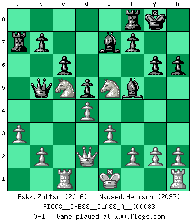 Last move : 0-1 2008 July 14 3:2:32 [Event "FICGS__CHESS__CLASS_A__000033"] [Site "FICGS"] [Date "2008.01.02"] [Round "1"] [White "Bakk,Zoltan"] [Black "Naused,Hermann"] [Result "0-1"] [WhiteElo "2016"] [BlackElo "2037"] 1.d4 d5 2.c4 c6 3.Nc3 Nf6 4.Bg5 e6 5.cxd5 exd5 6.Qc2 Na6 7.e3 Nb4 8.Qb1 h6 9.Bh4 g6 10.Qd1 Bf5 11.Rc1 a5 12.a3 Na6 13.Nf3 Be7 14.Qb3 Ra7 15.Bxa6 a4 16.Nxa4 Qa5+ 17.Qc3 Qxa6 18.Nc5 Qb5 19.Bxf6 Bxf6 20.Ne5 Be7 21.Qd2 O-O 0-1 This chess game has been lost on time (started : 2008.01.02 8:27:42) Comment by player 1 : Zoltan Bakk : It seems to be Slav Defense, but let us see what will happen... 5.cxd5 exd5 : Now it seems to be QGD / Exchange Variation, with the g1N still undeveloped QGD Slav defense Kingside Castling by player Black (move 21) Player Black won this chess game. Follow this game move after move (download)The Pawns are the soul of the game. (Francois Andre Danican Philidor) Wenn es im Universum noch irgendwo intelligente Lebewesen gibt, dann kennen sie Go. (Emanuel Lasker) Un entendimiento minucioso de las típicas continuaciones de mate hacen de las mas complicadas combinaciones de sacrificio que conducen hacia ellas no solo no dificiles, sino casi un asunto de rutina. (Siegbert Tarrasch) Il (Jacob Murray) ne joue pas pour le bon coup, mais pour le meilleur. (Eloi Relange) Two beer, or not two beer. (Unknown)