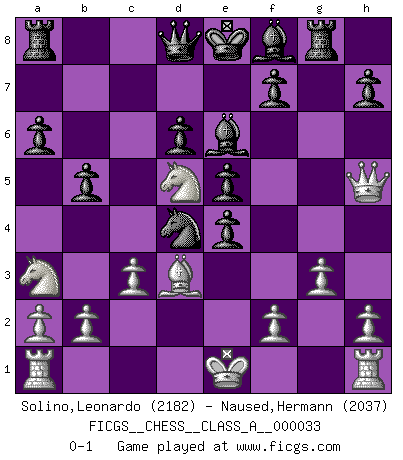 Last move : 0-1 2008 April 21 8:20:37 [Event "FICGS__CHESS__CLASS_A__000033"] [Site "FICGS"] [Date "2008.01.02"] [Round "1"] [White "Solino,Leonardo"] [Black "Naused,Hermann"] [Result "0-1"] [WhiteElo "2182"] [BlackElo "2037"] 1.e4 c5 2.Nf3 Nc6 3.d4 cxd4 4.Nxd4 Nf6 5.Nc3 e5 6.Ndb5 d6 7.Bg5 a6 8.Na3 b5 9.Bxf6 gxf6 10.Nd5 f5 11.Bd3 Be6 12.Qh5 Rg8 13.g3 Nd4 14.c3 fxe4 0-1 This chess game has been lost on time (started : 2008.01.02 8:27:42) Sicilian : Pelikan (Lasker/Sveshnikov) variation Player Black won this chess game. Follow this game move after move (download)There are two types of sacrifices: correct ones and mine. (Mikhail Tal) Schach verlangt totale Konzentration. (Robert James Fischer) Siempre es mejor sacrificar los hombres de tu oponente. (Savielly Tartakower) La vérité est comme le meilleur coup aux échecs : elle existe, mais il faut la chercher. (Arturo Perez-Reverte) The weakness of an artist is dogma. (Josh Waitzkin)