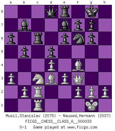 Last move : 0-1 2008 July 6 2:28:43 [Event "FICGS__CHESS__CLASS_A__000033"] [Site "FICGS"] [Date "2008.01.02"] [Round "1"] [White "Musil,Stanislav"] [Black "Naused,Hermann"] [Result "0-1"] [WhiteElo "2075"] [BlackElo "2037"] 1.c4 Nf6 2.Nc3 e6 3.Nf3 d5 4.d4 c6 5.Bg5 Nbd7 6.cxd5 cxd5 7.e3 a6 8.Bd3 b5 9.O-O Bb7 10.Bf4 Be7 11.Ne5 O-O 12.Rc1 Rc8 13.Qf3 Re8 14.a3 Nf8 15.Rc2 Ng6 16.Nxg6 hxg6 17.Rfc1 Rc6 0-1 This chess game has been lost on time (started : 2008.01.02 8:27:42) English Opening Kingside Castling by player White (move 9) Kingside Castling by player Black (move 11) Player Black won this chess game. Follow this game move after move (download)A win by an unsound combination, however showy, fills me with artistic horror. (Wilhelm Steinitz) Es macht mich traurig, wenn ich sehe, dass Golfprofis mehr verdienen als Schachsportler. Obwohl ich davon überzeugt bin, dass wir Schachspieler viel härter trainieren müssen als die Golfer. (Alexandra Kosteniuk) El Ajedrez es tan inspirador que yo no creo que un buen jugador sea capaz de tener un pensamiento malo durante una partida. (Wilhelm Steinitz) Il vaut mieux sacrifier les pièces de l'adversaire. (Xavier Tartacover) Empty your mind, be formless, shapeless — like water. (Bruce Lee)