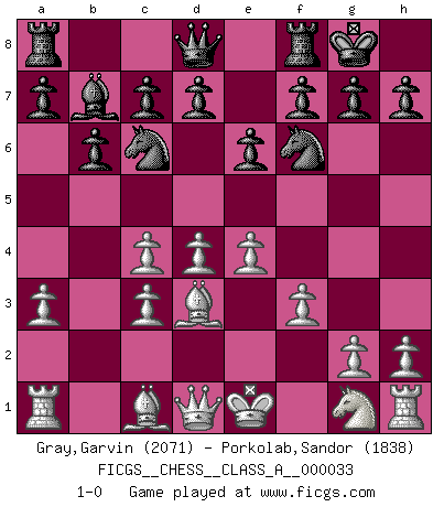 Last move : 1-0 2008 March 2 14:59:7 [Event "FICGS__CHESS__CLASS_A__000033"] [Site "FICGS"] [Date "2008.01.02"] [Round "1"] [White "Gray,Garvin"] [Black "Porkolab,Sandor"] [Result "1-0"] [WhiteElo "2071"] [BlackElo "1838"] 1.d4 Nf6 2.c4 e6 3.Nc3 Bb4 4.a3 Bxc3+ 5.bxc3 O-O 6.e3 b6 7.Bd3 Bb7 8.f3 Nc6 9.e4 1-0 This chess game has been lost on time (started : 2008.01.02 8:27:42) Nimzo-Indian : Saemisch variation Kingside Castling by player Black (move 5) Player White won this chess game. Follow this game move after move (download)I won't play with you anymore. You have insulted my friend. - When an opponent cursed himself for a blunder. (Miguel Najdorf) Ich bin es gewohnt, das die Jugend mir überhaupt keinen Respekt entgegenbringt. (Alexander Morozewich) ¡Examina movidas que hagan daño! Un buen ojo for movidas desvastantes es mucho mas importante que el conocimiento de principios estratégicos. (Purdy) Aux échecs, l'amour-propre est satisfait quand on remporte la victoire, mais il n'y a pas de honte à être battu. (Benjamin Franklin) Drag your thoughts away from your troubles... by the ears, by the heels, or any other way you can manage it. (Mark Twain)
