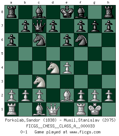 Last move : 0-1 2008 February 19 13:50:11 [Event "FICGS__CHESS__CLASS_A__000033"] [Site "FICGS"] [Date "2008.01.02"] [Round "1"] [White "Porkolab,Sandor"] [Black "Musil,Stanislav"] [Result "0-1"] [WhiteElo "1838"] [BlackElo "2075"] 1.e4 c5 2.Nf3 Qc7 3.d4 cxd4 4.Nxd4 Nf6 5.Nc3 a6 6.Be2 e6 7.O-O Nc6 0-1 This chess game has been lost on time (started : 2008.01.02 8:27:42) Sicilian : Quinteros variation Kingside Castling by player White (move 7) Player Black won this chess game. Follow this game move after move (download)The combination player thinks forward; he starts from the given position, and tries the forceful moves in his mind. (Emanuel Lasker) Verschiedene, sehr schätzbare und im Laufe des Lebens nützliche Eigenschaften des Geistes können durch das Schachspiel erworben und gekräftigt werden, so dass sie zu Gewohnheiten werden, die uns nie im Stich lassen. (Benjamin Franklin) Nos gusta pensar. (Gary Kasparov) Les échecs sont utiles à l'exercice de la faculté de penser et à celle de l'imagination. Car nous devons posséder une méthode élaborée pour atteindre des buts partout où nous devons conduire notre raison. (Leibnitz) Nobody is always a winner, and anybody who says he is, is either a liar or doesn't play poker. (Amarillo Slim)
