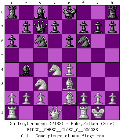Last move : 0-1 2008 March 13 4:2:4 [Event "FICGS__CHESS__CLASS_A__000033"] [Site "FICGS"] [Date "2008.01.02"] [Round "1"] [White "Solino,Leonardo"] [Black "Bakk,Zoltan"] [Result "0-1"] [WhiteElo "2182"] [BlackElo "2016"] 1.e4 c5 2.Nf3 e6 3.d4 cxd4 4.Nxd4 Nc6 5.Nc3 Qc7 6.Be2 a6 7.O-O Nf6 8.Be3 Bb4 0-1 This chess game has been lost on time (started : 2008.01.02 8:27:42) Sicilian : Taimanov (Bastrikov) variation Kingside Castling by player White (move 7) Player Black won this chess game. Follow this game move after move (download)Pawns: they are the soul of this game, they alone form the attack and defense. (Philidor) Es liegt in der Natur, vernüftig zu denken und unlogisch zu handeln. (Anatole France) El Ajedrez es un invernadero donde los frutos del carácter pueden madurar mas completamente que en la vida. (Edward Morgan Foster) La tactique est l'élément le plus important du milieu de jeu. (Siegbert Tarrasch) What doesn't kill us makes us stronger. (Friedrich Nietzsche)