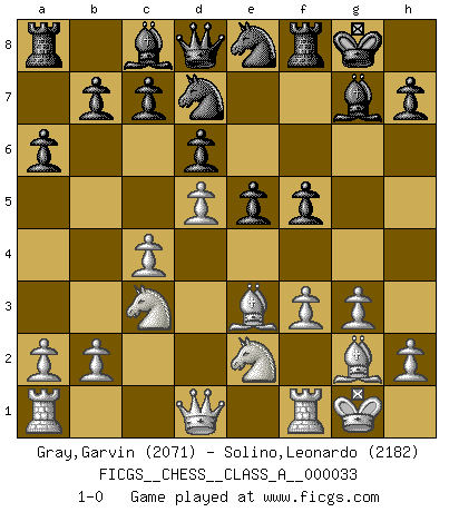 Last move : 1-0 2008 April 21 8:20:37 [Event "FICGS__CHESS__CLASS_A__000033"] [Site "FICGS"] [Date "2008.01.02"] [Round "1"] [White "Gray,Garvin"] [Black "Solino,Leonardo"] [Result "1-0"] [WhiteElo "2071"] [BlackElo "2182"] 1.d4 Nf6 2.c4 g6 3.Nc3 Bg7 4.e4 d6 5.g3 O-O 6.Bg2 e5 7.d5 Nbd7 8.Nge2 Ne8 9.O-O f5 10.exf5 gxf5 11.f3 a6 12.Be3 1-0 This chess game has been lost on time (started : 2008.01.02 8:27:42) King's Indian with e4 & g3 Kingside Castling by player Black (move 5) Kingside Castling by player White (move 9) Player White won this chess game. Follow this game move after move (download)The most important feature of the Chess position is the activity of the pieces. This is absolutely fundamental in all phases of the game: Opening, Middlegame and especially Endgame. The primary constraint on a piece's activity is the Pawn structure. (Michael Stean) Wie kann ich Remis annehmen? Ich weiß ja gar nicht, wie ich stehe! (Fritz Sämisch) El estómago es una parte esencial del maestro de Ajedrez. (Bent Larsen) Les échecs c'est le défi de l'alpiniste, toujours plus haut, prêt à tout pour monter à l'assaut du Roi ennemi. Les échecs, c'est de la musique en mouvement, un ballet majestueux pour les yeux. C'est de la poésie composée par les fantômes du passé qui au même titre que Rimbaud ou Verlaine méritent notre admiration. Les échecs, c'est de la peinture ou le moindre mouvement modifie le tableau pour en faire un Picasso ou un Van Gogh. Les échecs, c'est tout et rien, c'est la vie et la mort. Jjulie33 sur le forum de France-Echecs. I know the human being and fish can coexist peacefully. (George W. Bush, Saginaw sept. 29, 2000)