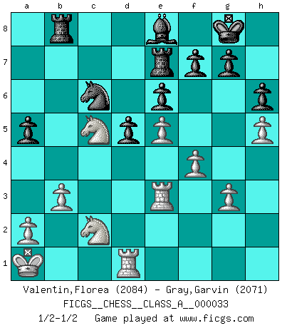 Last move : 1/2-1/2 2008 July 9 20:16:16 [Event "FICGS__CHESS__CLASS_A__000033"] [Site "FICGS"] [Date "2008.01.02"] [Round "1"] [White "Valentin,Florea"] [Black "Gray,Garvin"] [Result "1/2-1/2"] [WhiteElo "2084"] [BlackElo "2071"] 1.e4 e6 2.d4 d5 3.Nc3 Nf6 4.e5 Nfd7 5.f4 c5 6.Nf3 Nc6 7.Be3 cxd4 8.Nxd4 Bc5 9.Qd2 O-O 10.O-O-O a6 11.Nb3 Bxe3 12.Qxe3 b5 13.Bd3 Nb6 14.h4 Rb8 15.h5 h6 16.Kb1 Nc4 17.Qf2 Bd7 18.Rhe1 Qe7 19.Nc5 Bc8 20.g3 Rd8 21.Nb3 Bd7 22.Qc5 a5 23.Qxe7 Nxe7 24.Nd4 Rdc8 25.Bxc4 bxc4 26.Re3 Rb6 27.Ka1 Rcb8 28.b3 cxb3 29.cxb3 Nc6 30.Nc2 Be8 31.Na4 R6b7 32.Nc5 Re7 1/2-1/2 French : Steinitz, Boleslavsky variation Kingside Castling by player Black (move 9) Queenside Castling by player White (move 10) This chess game ended in a draw. Follow this game move after move (download)If one piece is badly posted, the whole game is bad. (Tarrasch) Früher wurde jeder komplizierte Zug, jedes interessante Opfer mit großem Beifall und Enthusiasmus aufgenommen. Heute schaltet man einfach seinen Fritz an, und man kann sehen, was los ist, ob der Zug geht oder nicht. (Vladimir Kramnik) Personalmente, yo prefiero mirar hacia el futuro en donde un programa de computadora gane el título mundial de Ajedrez. La humanidad necesita una lección de humildad. (Richard Dawkings) C'est la seule position que je connaisse où les deux camps sont mals. Propos prêtés à V. Anand. He who laughs last probably does not get the joke. (Unknown)