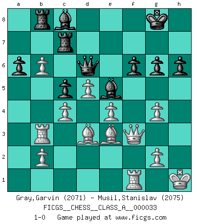 Last move : 1-0 2008 July 20 3:37:51 [Event "FICGS__CHESS__CLASS_A__000033"] [Site "FICGS"] [Date "2008.01.02"] [Round "1"] [White "Gray,Garvin"] [Black "Musil,Stanislav"] [Result "1-0"] [WhiteElo "2071"] [BlackElo "2075"] 1.d4 Nf6 2.c4 g6 3.Nc3 Bg7 4.e4 O-O 5.f4 d6 6.Nf3 c5 7.d5 a6 8.a4 e5 9.fxe5 Ng4 10.exd6 Qxd6 11.Bd3 Nb8d7 12.O-O Bd4 13.Kh1 Nde5 14.Nxe5 Bxe5 15.h3 Bxc3 16.hxg4 Be5 17.Bh6 Re8 18.Qf3 Re7 19.Bg5 Rc7 20.a5 h6 21.Be3 f6 22.Ra3 Rb8 23.Rb3 b5 24.axb6 1-0 King's Indian : 4.e4 Kingside Castling by player Black (move 4) Kingside Castling by player White (move 12) Player White won this chess game. Follow this game move after move (download)Chess, like love, like music, has the power to make people happy. (Siegbert Tarrasch) Als ich elf wurde, wurde ich einfach gut. (Robert James Fischer) El Ajedrez lo es todo: arte, ciencia y deporte. (Anatoly Karpov) J'ai toujours senti une vague pitié pour l'homme qui ne connaît rien aux échecs, tout comme j'en aurais pour un homme ignorant de l'amour. Les Echecs, comme la musique ou comme l'amour, ont le pouvoir de rendre heureux. (Siegbert Tarrasch) Life is painting a picture, not doing a sum. (Oliver Wendell Holmes, Jr.)