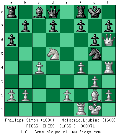Last move : 1-0 2008 January 16 22:41:24 [Event "FICGS__CHESS__CLASS_C__000071"] [Site "FICGS"] [Date "2008.01.04"] [Round "1"] [White "Phillips,Simon"] [Black "Malbasic,Ljubisa"] [Result "1-0"] [WhiteElo "1800"] [BlackElo "1600"] 1.Nf3 Nf6 2.g3 g6 3.Bg2 Bg7 4.O-O O-O 5.c4 c5 6.d4 e6 7.dxc5 Nc6 8.Nc3 a6 9.Bf4 Ne8 10.Qd2 e5 11.Be3 Nc7 12.Nd5 Ne6 13.Rad1 Ncd4 14.Nxd4 exd4 15.Bh6 Bxh6 16.Qxh6 Nxc5 17.Rxd4 Ne6 18.Rh4 Ng5 19.f4 1-0 Reti : King's Indian attack Kingside Castling by player White (move 4) Kingside Castling by player Black (move 4) Player White won this chess game. Follow this game move after move (download)White lost because he failed to remember the right continuation and had to think up the moves himself. (Siegbert Tarrasch) Wer der Ansicht ist, daß alle Schachspieler verrückt sind, wird durch Studium des Lebens von Emil Josef Diemer nicht auf andere Gedanken kommen. (Hans Ree) El Ajedrez tiene tanto misterio como las mujeres. (Purdy) Echiquier : carré parfait, comme la Jérusalem nouvelle décrite par l'auteur de l'Apocalypse, huit cases sur huit, exaltation du chiffre 4, symbole du cosmos aux quatre horizons... où le noir et le blanc, l'ombre et la lumière, le mal et le bien s'entremêlent et se conjuguent. (Robert Couffignal, Le Gambit du poète) Somehow our devils are never quite what we expect when we meet them face to face. (Nelson DeMille)