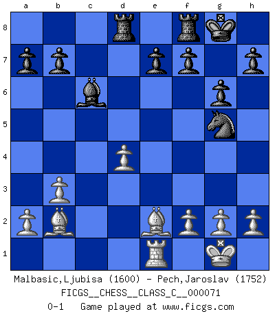 Last move : 0-1 2008 April 22 9:48:16 [Event "FICGS__CHESS__CLASS_C__000071"] [Site "FICGS"] [Date "2008.01.04"] [Round "1"] [White "Malbasic,Ljubisa"] [Black "Pech,Jaroslav"] [Result "0-1"] [WhiteElo "1600"] [BlackElo "1752"] 1.d4 Nf6 2.Nf3 g6 3.e3 Bg7 4.Nbd2 d5 5.c4 O-O 6.Be2 c5 7.O-O cxd4 8.exd4 Nc6 9.b3 dxc4 10.Nxc4 Bf5 11.Bb2 Qc7 12.Rc1 Rad8 13.Qe1 Be4 14.Nce5 Bh6 15.Nd2 Bxd2 16.Qxd2 Qxe5 17.Rxc6 Bxc6 18.Re1 Ne4 19.Qc1 Qg5 20.Qxg5 Nxg5 0-1 King's Indian : East Indian defense Kingside Castling by player Black (move 5) Kingside Castling by player White (move 7) Player Black won this chess game. Follow this game move after move (download)All that matters on the Chessboard is good moves. (Bobby Fischer) Schach ist das Spiel, das die Verrückten gesund hält. (Albert Einstein) Mi estilo es algo parecido entre un poco de Tal y Petrosian. (Reshevsky) Le plus grand jeu de l'esprit jamais inventé, plus vous l'apprenez, plus vous y prenez du plaisir. (Garry Kasparov) Thibault, I ask for draw. Game 13876. - Sorry Ilmars, you won. (FICGS chat)