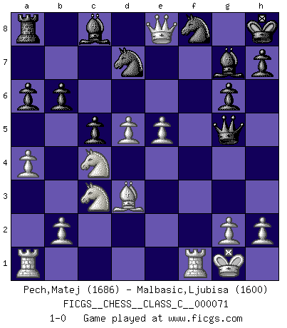 Last move : 1-0 2008 April 30 22:39:50 [Event "FICGS__CHESS__CLASS_C__000071"] [Site "FICGS"] [Date "2008.01.04"] [Round "1"] [White "Pech,Matej"] [Black "Malbasic,Ljubisa"] [Result "1-0"] [WhiteElo "1686"] [BlackElo "1600"] 1.d4 Nf6 2.c4 c5 3.d5 e6 4.Nc3 exd5 5.cxd5 d6 6.Nf3 Be7 7.e4 O-O 8.Be2 Nbd7 9.O-O a6 10.a4 Re8 11.Nd2 b6 12.f4 Bf8 13.Bd3 g6 14.Qf3 Bg7 15.Nc4 Nf8 16.e5 dxe5 17.fxe5 N6d7 18.Qxf7+ Kh8 19.Bg5 Qxg5 20.Qxe8 1-0 Benoni defense Kingside Castling by player Black (move 7) Kingside Castling by player White (move 9) Player White won this chess game. Follow this game move after move (download)Capture of the adverse King is the ultimate but not the first object of the game. (William Steinitz) Schach ist ein schwarz-weisser Dschungel. (Garry Kasparov) Solo el jugador con la iniciativa tiene el derecho a atacar. (Wilhelm Steinitz) Les ravages du H expliquent la différence de niveau entre Tal et Thal [Abergel]. Art disturbs, science reassures. (Georges Braque, Le Jour et la Nuit)