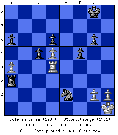 Last move : 0-1 2008 February 22 4:1:4 [Event "FICGS__CHESS__CLASS_C__000071"] [Site "FICGS"] [Date "2008.01.04"] [Round "1"] [White "Coleman,James"] [Black "Stibal,George"] [Result "0-1"] [WhiteElo "1700"] [BlackElo "1931"] 1.d4 Nf6 2.c4 e6 3.Nc3 c5 4.d5 exd5 5.cxd5 d6 6.e4 g6 7.f4 Bg7 8.Nf3 O-O 9.Be2 Bg4 10.O-O Nbd7 11.Be3 Re8 12.Nd2 Bxe2 13.Qxe2 b5 14.f5 b4 15.Nb5 Qb6 16.fxg6 hxg6 17.a4 Nxe4 18.Qf3 f5 19.Nc4 Qd8 20.Bf4 Ne5 21.Bxe5 Bxe5 22.Rae1 Bxb2 23.Nxb2 a6 24.Na3 bxa3 25.Qxa3 Qf6 26.Rd1 Nc3 27.Rd3 Ne2+ 28.Kh1 Re4 29.Re3 Rae8 30.Nc4 Rxe3 31.Nxe3 Qd4 32.Rd1 Rxe3 33.Rxd4 Rxa3 0-1 Queen's pawn game Kingside Castling by player Black (move 8) Kingside Castling by player White (move 10) Player Black won this chess game. Follow this game move after move (download)Tactics flow from a superior position. (Bobby Fischer) Es ist schade, dass viele Schachsportler vergessen, wie wichtig Auftreten und angemessene Kleidung sind. (Alexandra Kosteniuk) Tu eres para mi la Reina en d8 y yo soy el Peón en d7!!. (GM Eduard Gufeld) Ce qui est bien, c'est d'avoir tout un tas de pièces en prise : l'adversaire ne peut en prendre qu'une à la fois. Cité par Thierry Audin. A computer lets you make more mistakes faster than any invention in human history - with the possible exceptions of handguns and tequila. (Mitch Ratcliffe)
